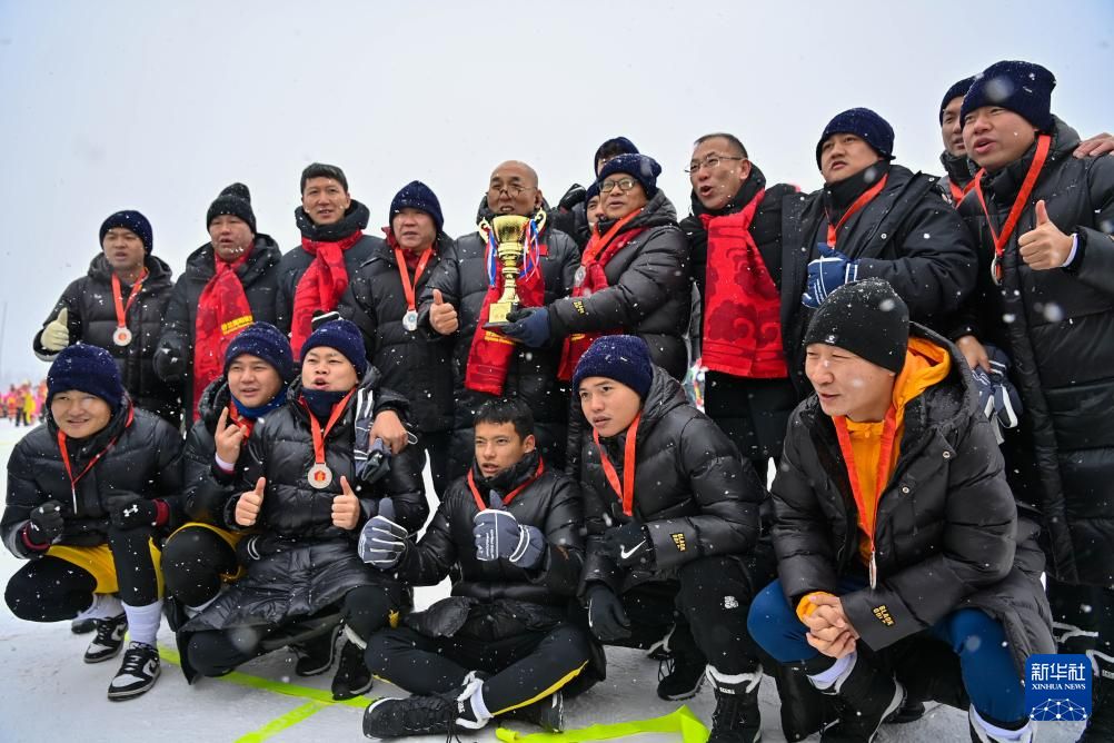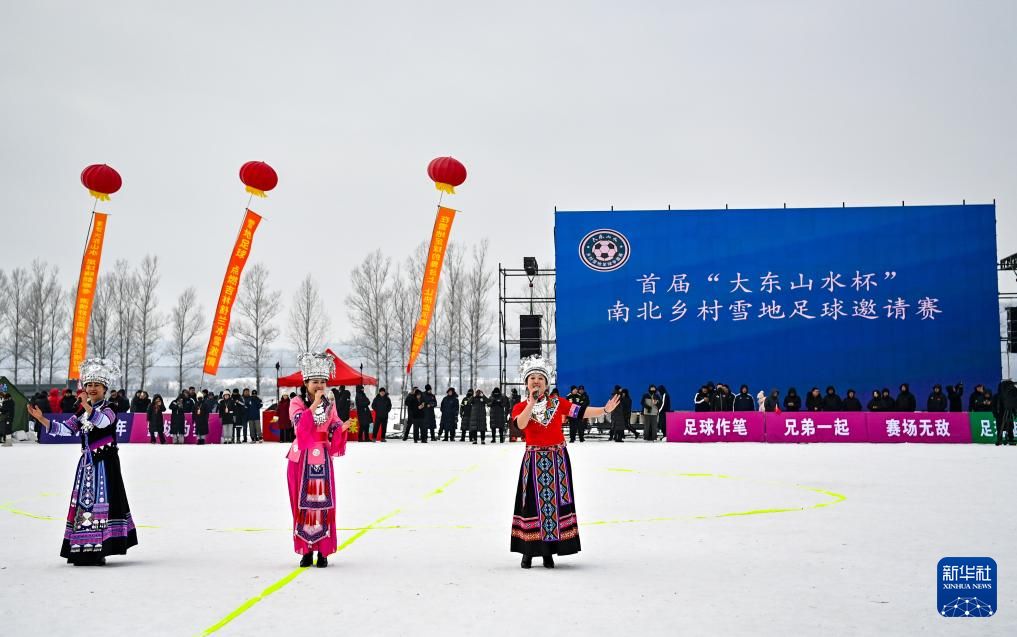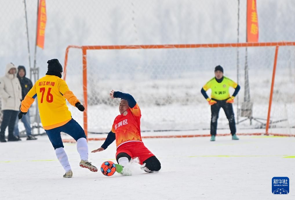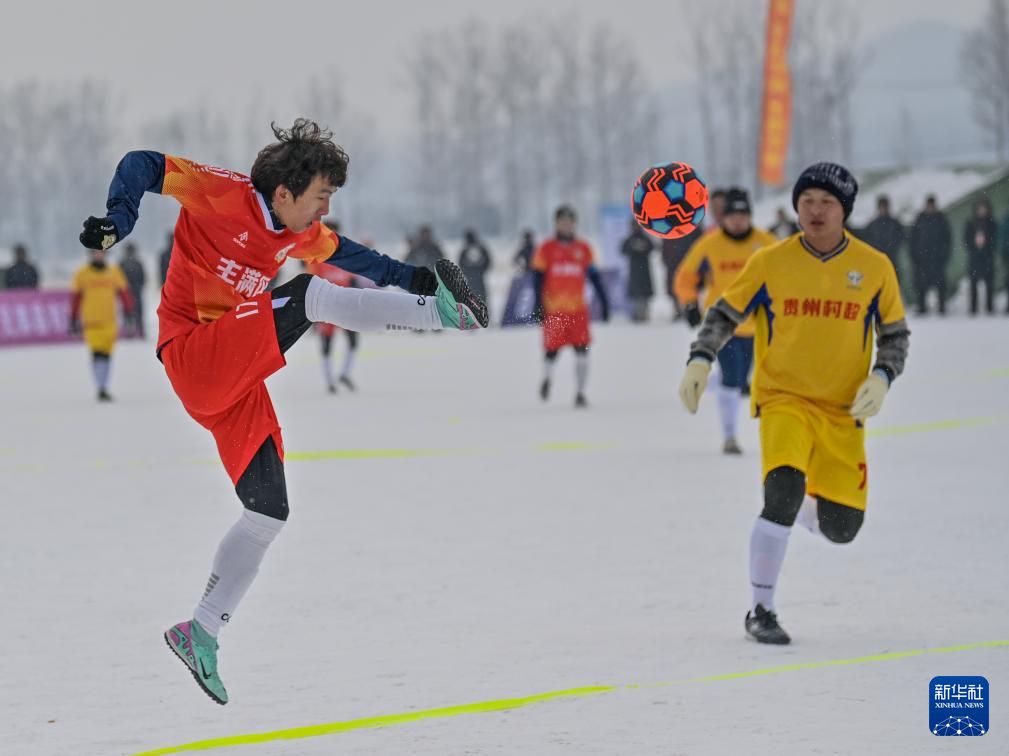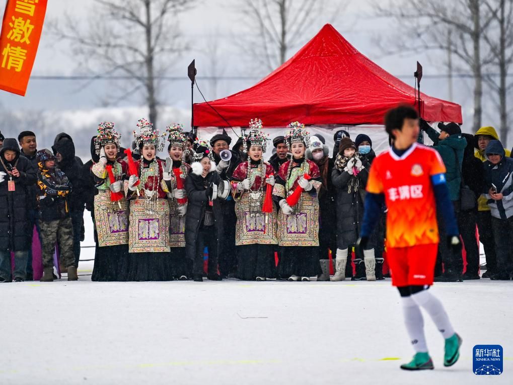 12月23日拍摄的南北乡村雪地足球邀请赛比赛现场(无人机拍摄)。