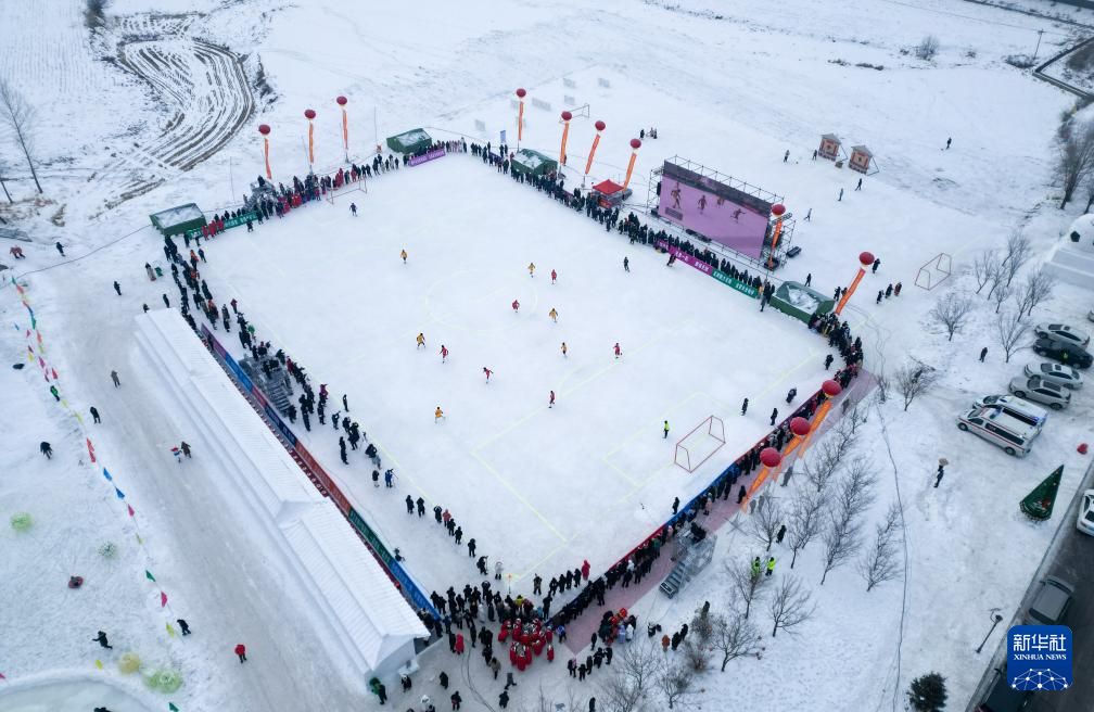 12月23日,南北乡村雪地足球邀请赛在吉林省舒兰市小城镇南阳村举行。贵州省榕江县的贵州村超队从3000公里外远赴东北,与东道主吉林市丰满区代表队在冰天雪地中开展一场友谊赛。图为当日拍摄的南北乡村雪地足球邀请赛比赛现场(无人机拍摄)。