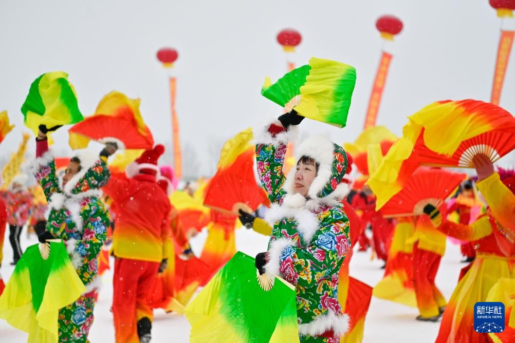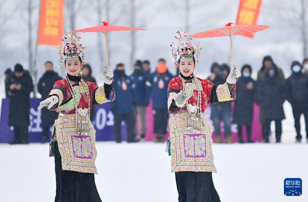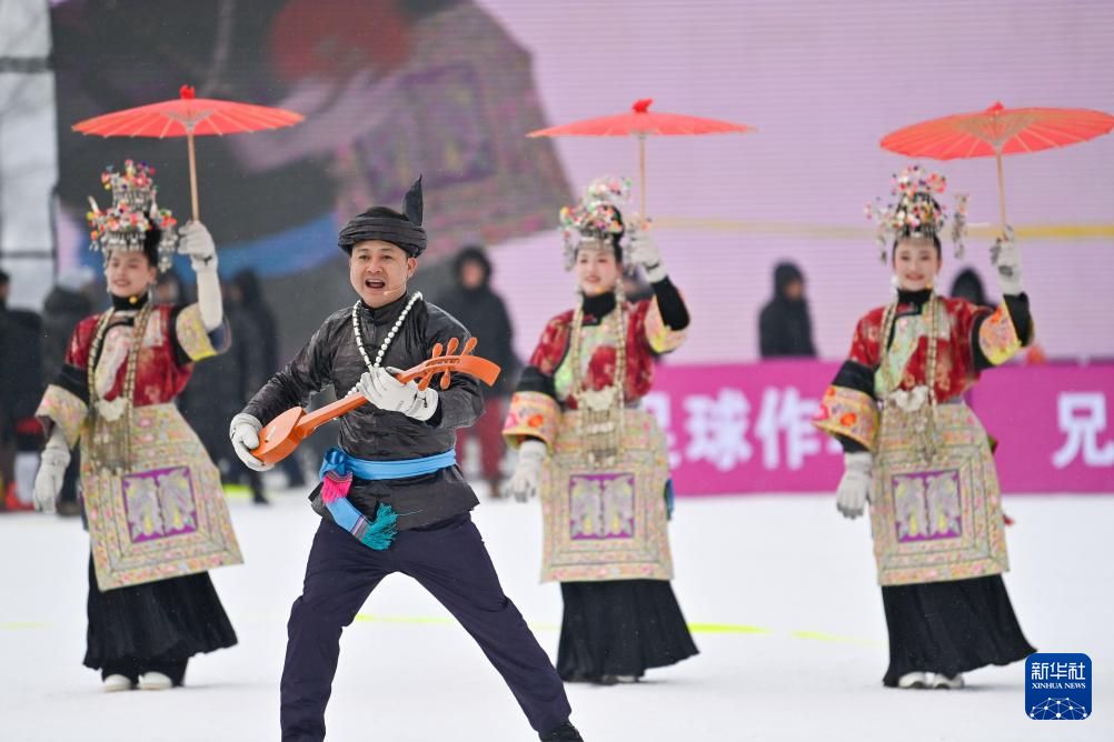 12月23日,来自贵州省榕江县的演员在中场休息时表演侗族歌舞。