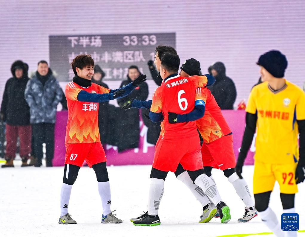 12月23日,丰满区代表队球员在比赛中庆祝进球。