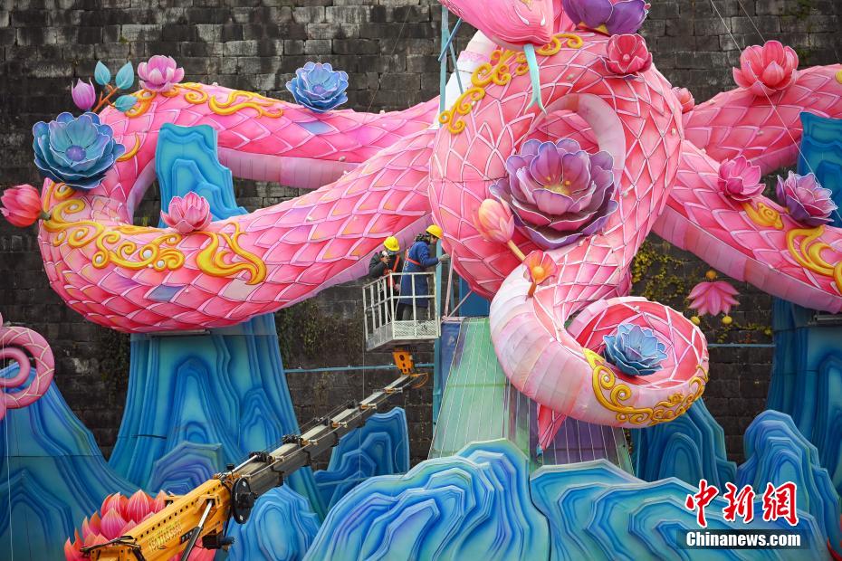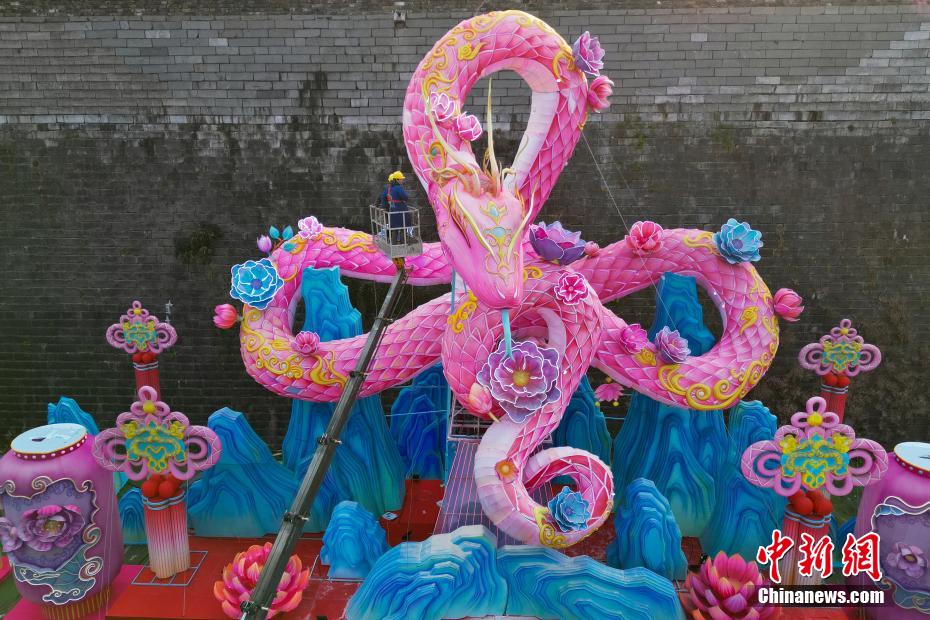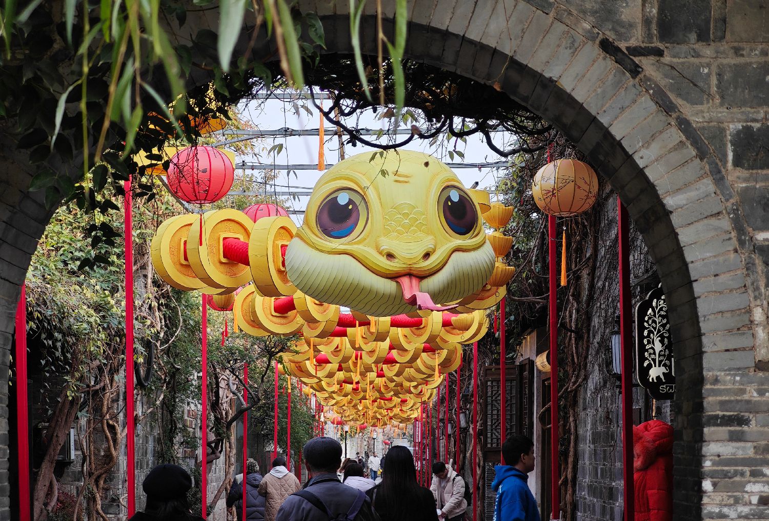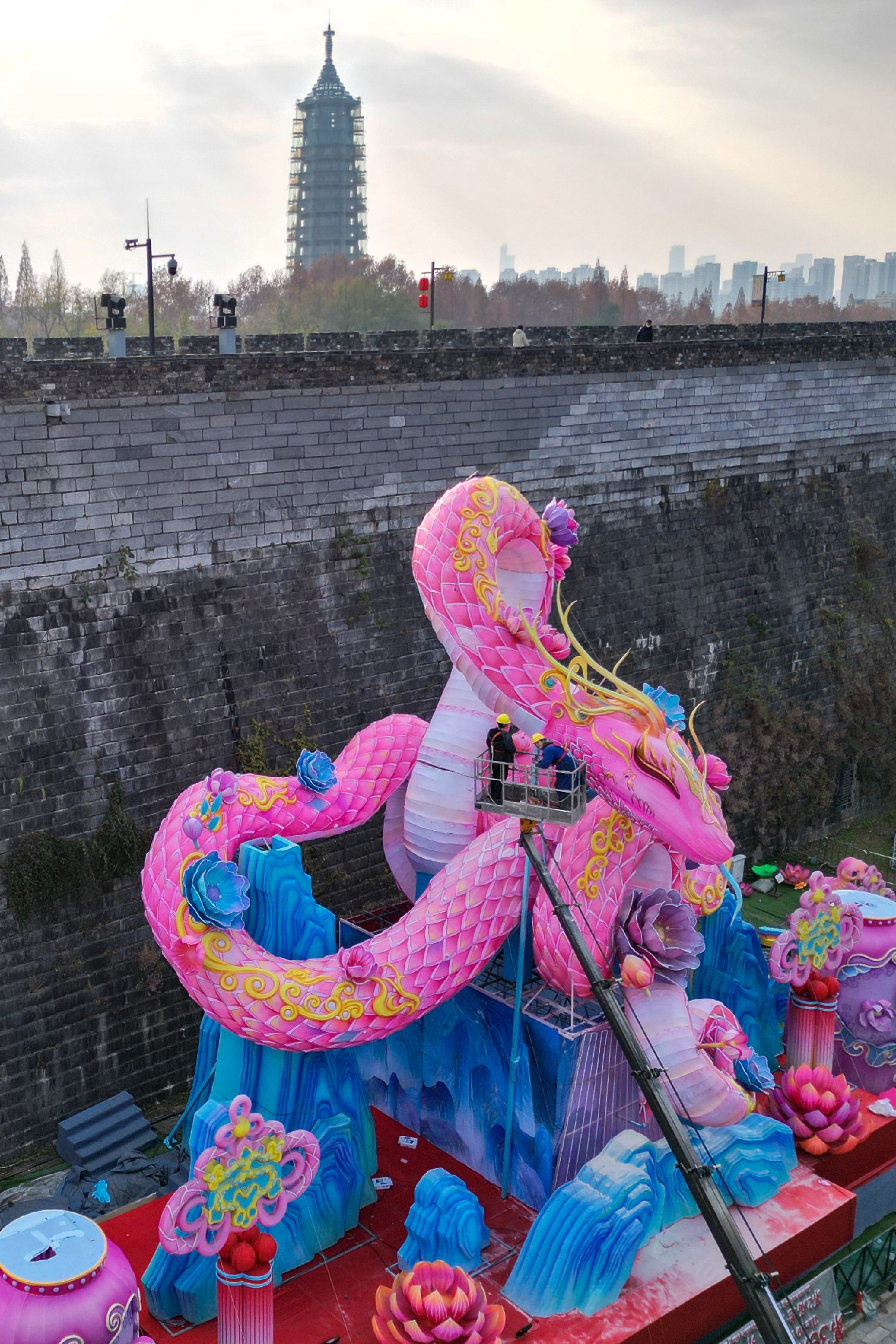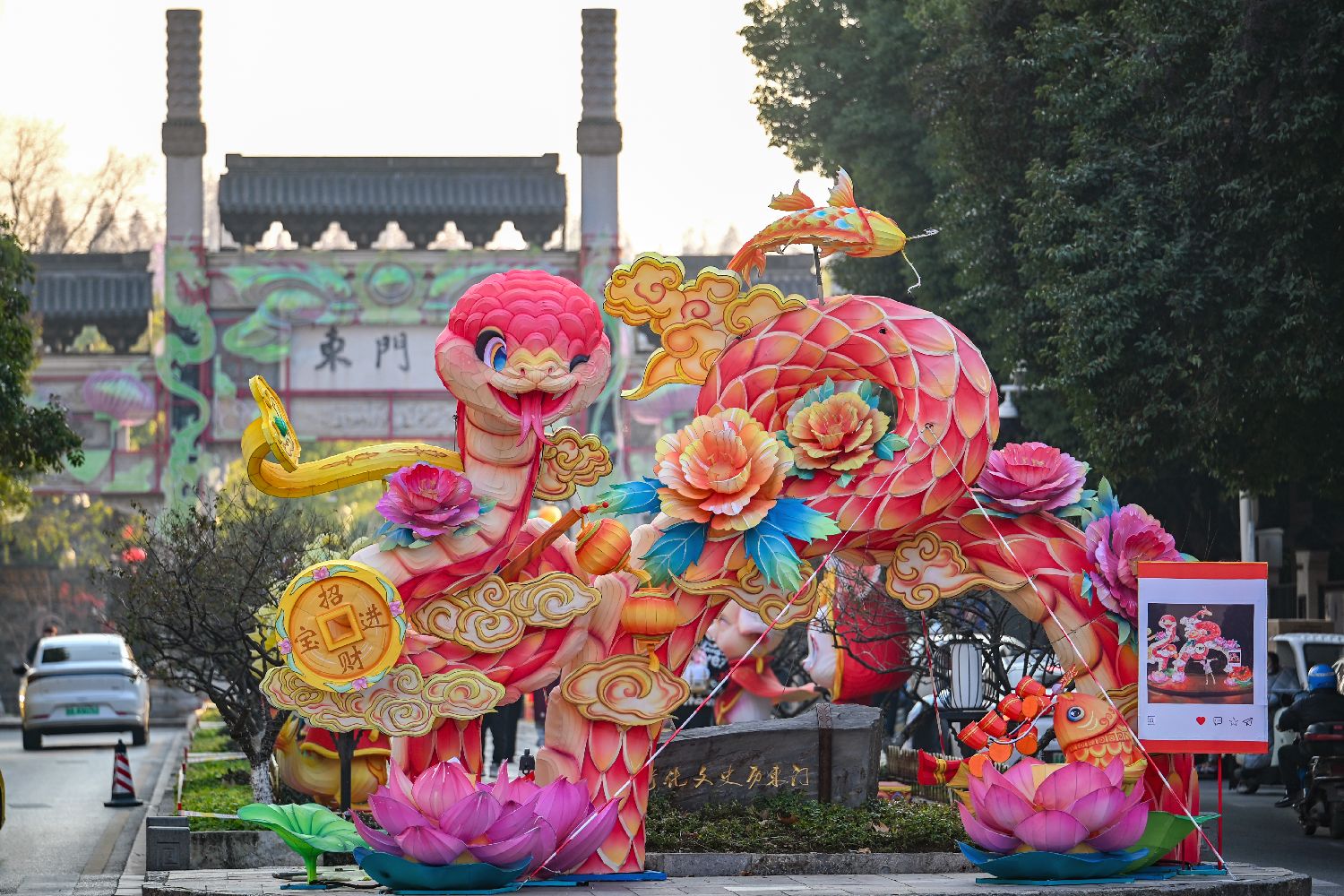 12月24日,江苏南京明城墙下城南老街布置巨型农历蛇年彩灯,营造新年喜庆氛围。中新社