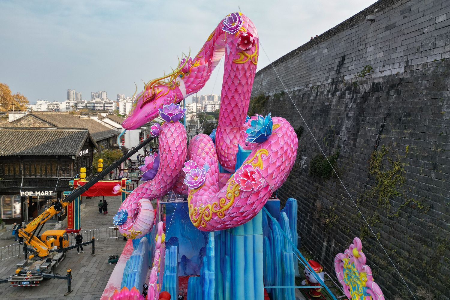 12月24日,江苏南京明城墙下城南老街布置巨型农历蛇年彩灯,营造新年喜庆氛围。(无人机照片)中新社