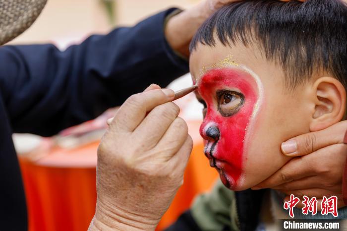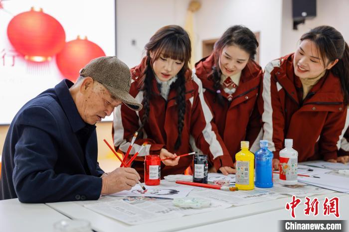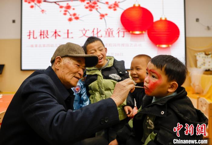 民间艺人在幼儿园教老师们画龙灯会人物脸谱。