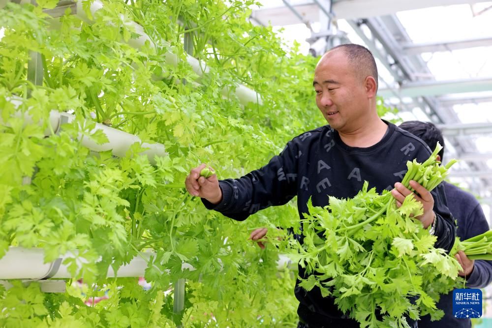 近年来,山东省枣庄市峄城区底阁镇探索“鱼菜共生”新模式,将水产养殖和无土栽培蔬菜技术结合,形成“鱼肥水、水浇菜、菜净水、水养鱼”的闭合循环,实现“养鱼不换水,种菜不施肥”,构建“鱼肥菜美”景象,有力促进农民增收,助力乡村振兴。图为12月24日,在山东省枣庄市峄城区底阁镇康庄村“鱼菜共生”智慧大棚内,管理人员在收获无土栽培的芹菜。
