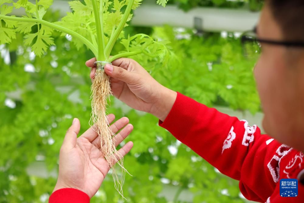 12月24日,在山东省枣庄市峄城区底阁镇康庄村“鱼菜共生”智慧大棚内,技术人员在查看无土栽培芹菜的根系生长情况。