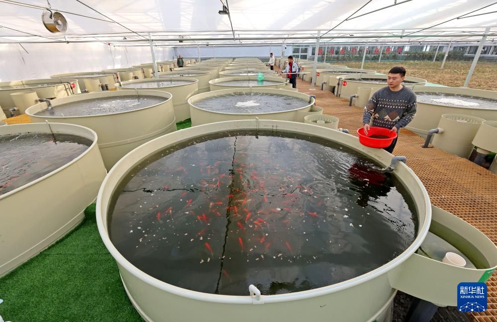 12月24日,在山东省枣庄市峄城区底阁镇康庄村“鱼菜共生”智慧大棚内,管理人员在投食喂养锦鲤。