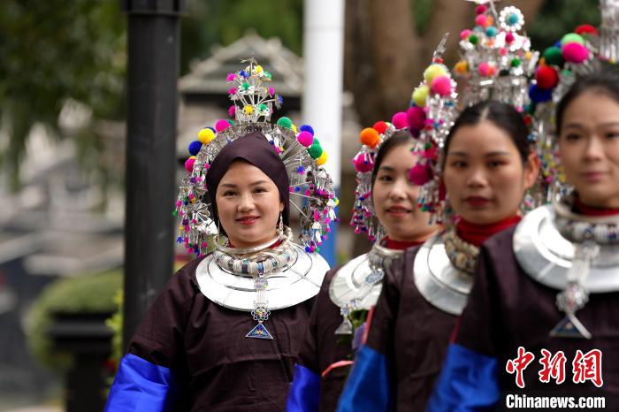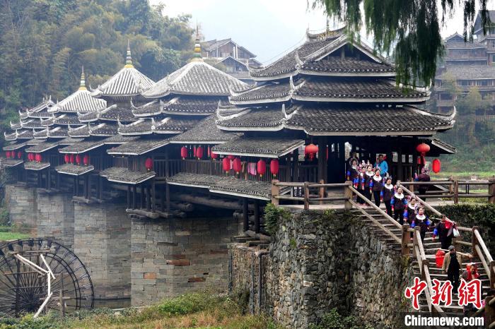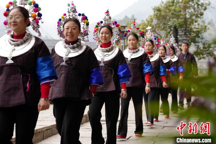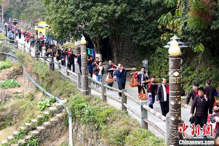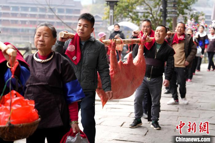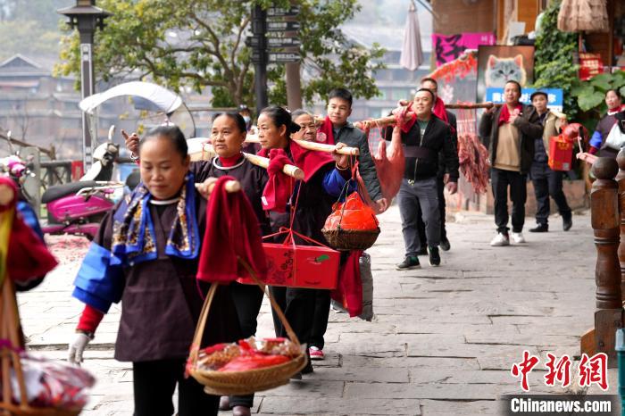 12月25日,在广西三江侗族自治县林溪镇平岩村,一支送亲队伍抬着红猪,挑着酸鱼、糍粑、糯米及米酒等贺礼送新娘回门。独具特色的传统侗族婚俗,成为当地一道风景线,吸引各地游客前来观看。图为送亲队伍送新娘回门。