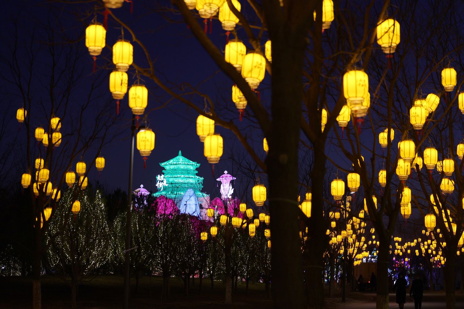 12月28日,巨型人物彩灯立于温榆河公园的道路两旁,民众观赏并拍照。中新网
