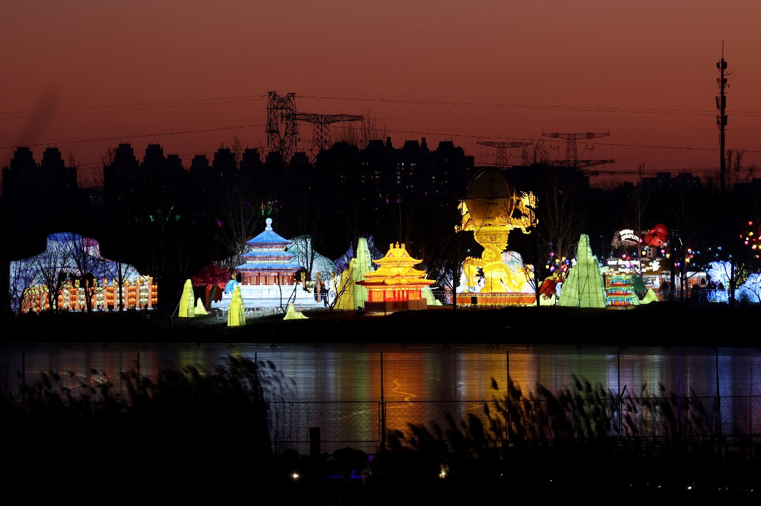 12月28日,民众走进温榆河公园参观彩灯。中新社