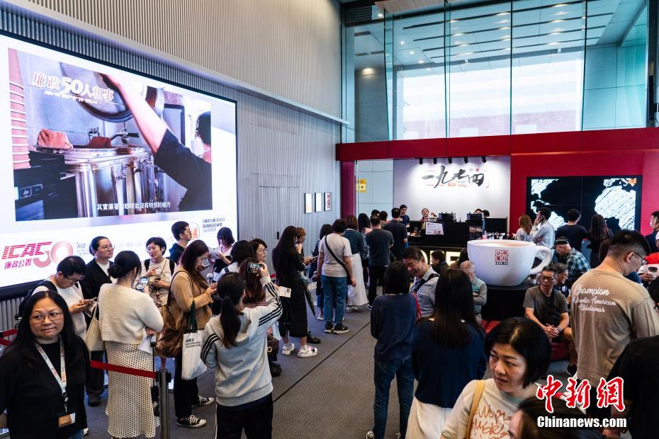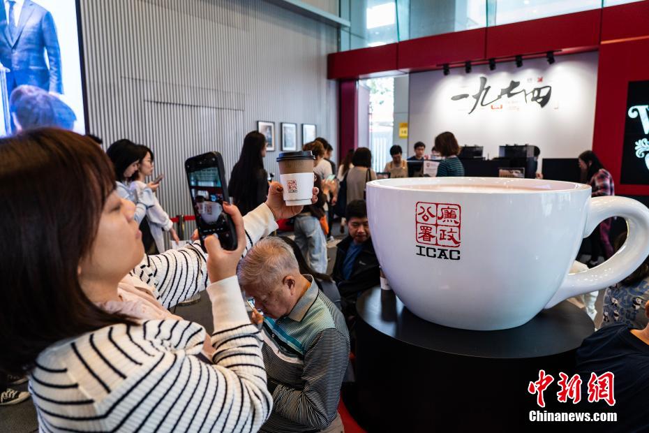 11月15日,廉署“一九七四”咖啡厅开业当日,一位女士购买咖啡后在经典的廉署咖啡杯布景前拍照“打卡”。