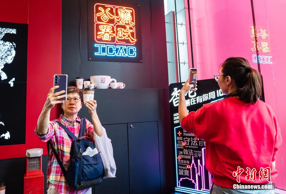11月15日,廉署“一九七四”咖啡厅开业当日,市民购买咖啡后在布景前拍照“打卡”。