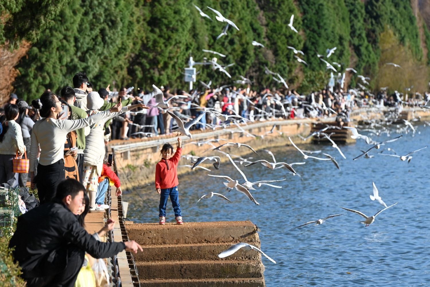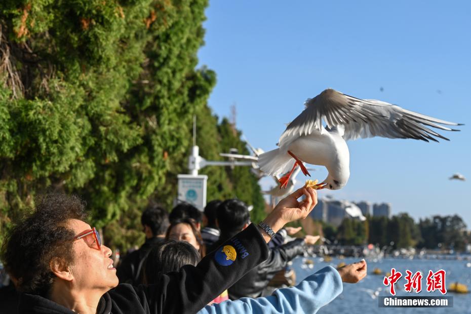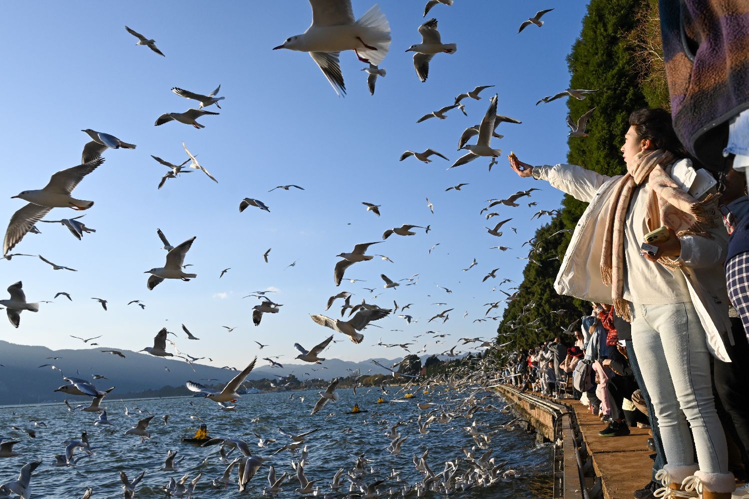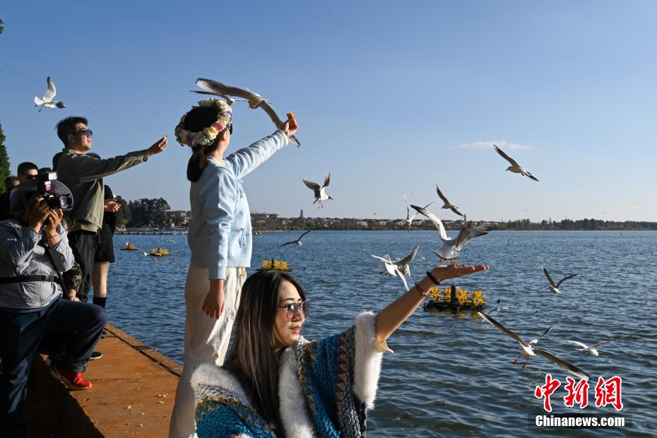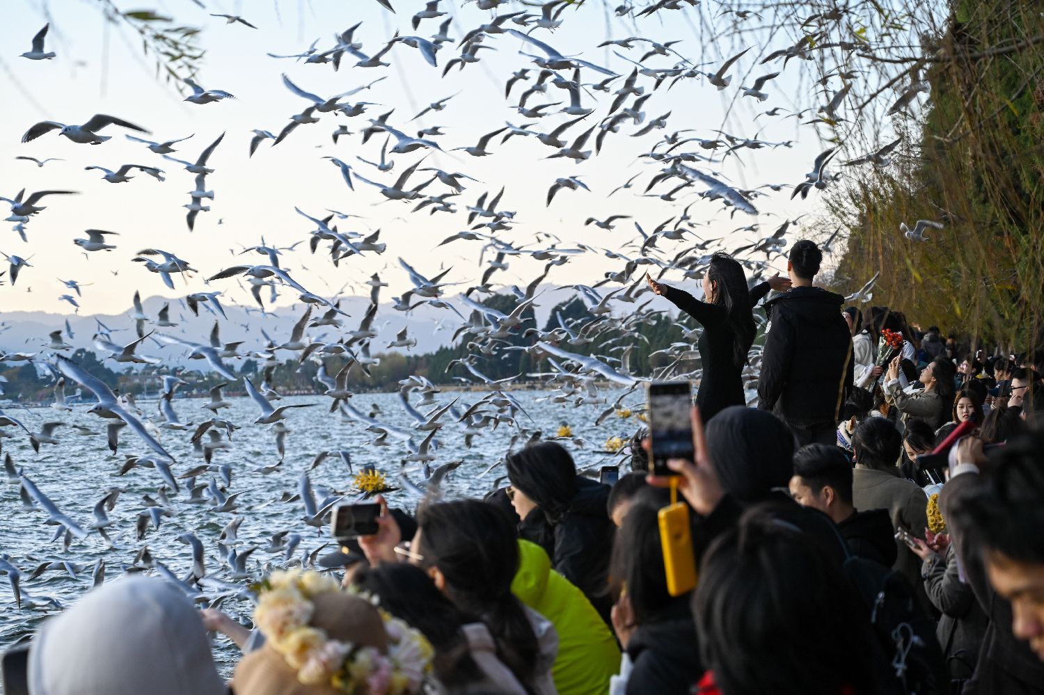 12月30日,游客在滇池畔与红嘴鸥互动。中新社