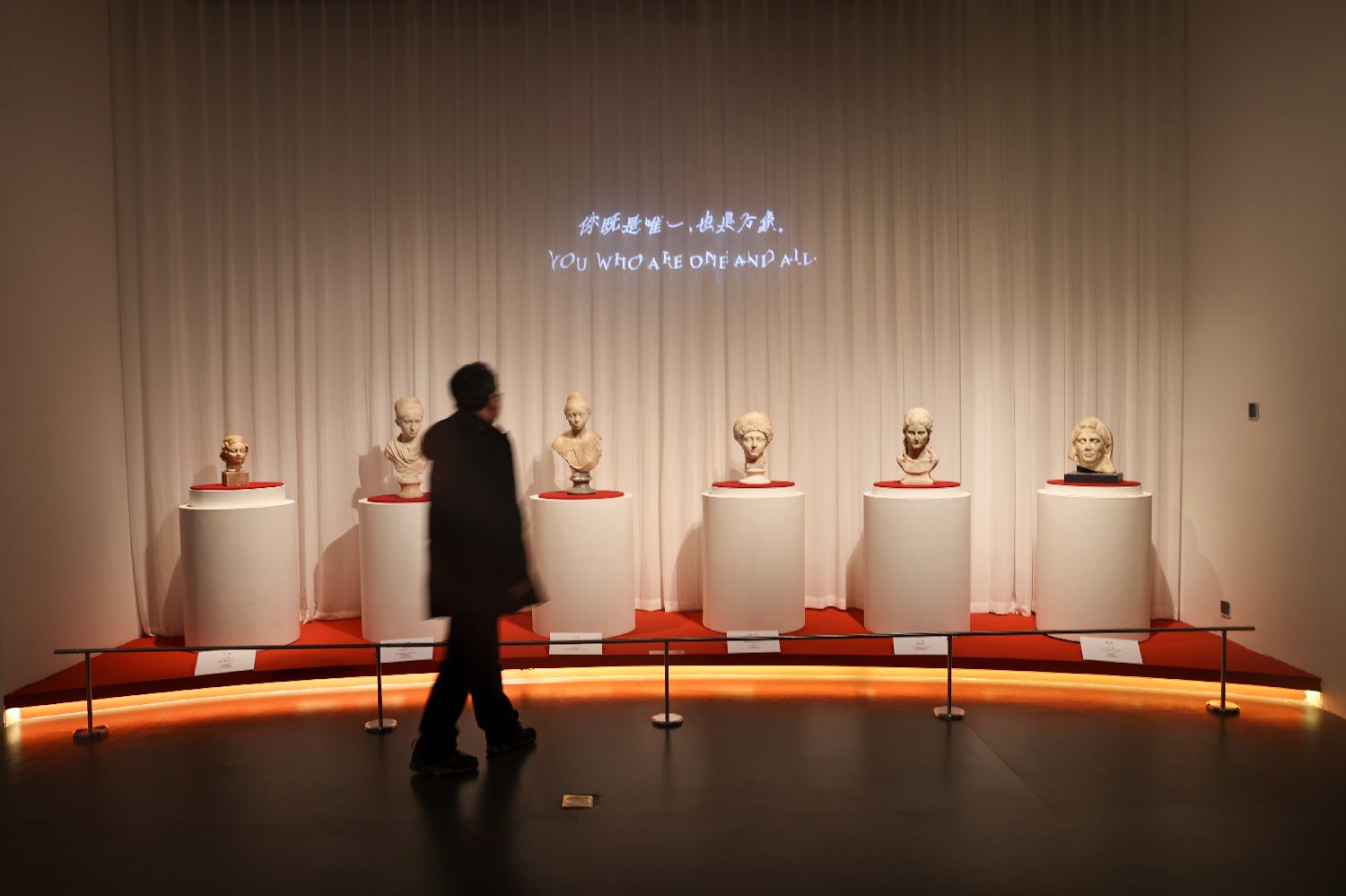 展览通过“自是归处”“ 峪涧芝兰”“泠光赋愿”“浅语流云”四个单元,分别讲述了古罗马女性的家庭生活、古罗马女性的社会生活、古罗马女性的精神生活和古罗马女性的多元角色。图为观众参观“漫步美中——古罗马时期女性主题文物展”。中新社