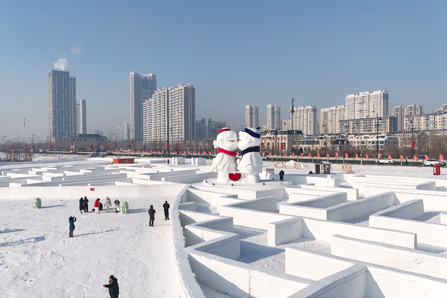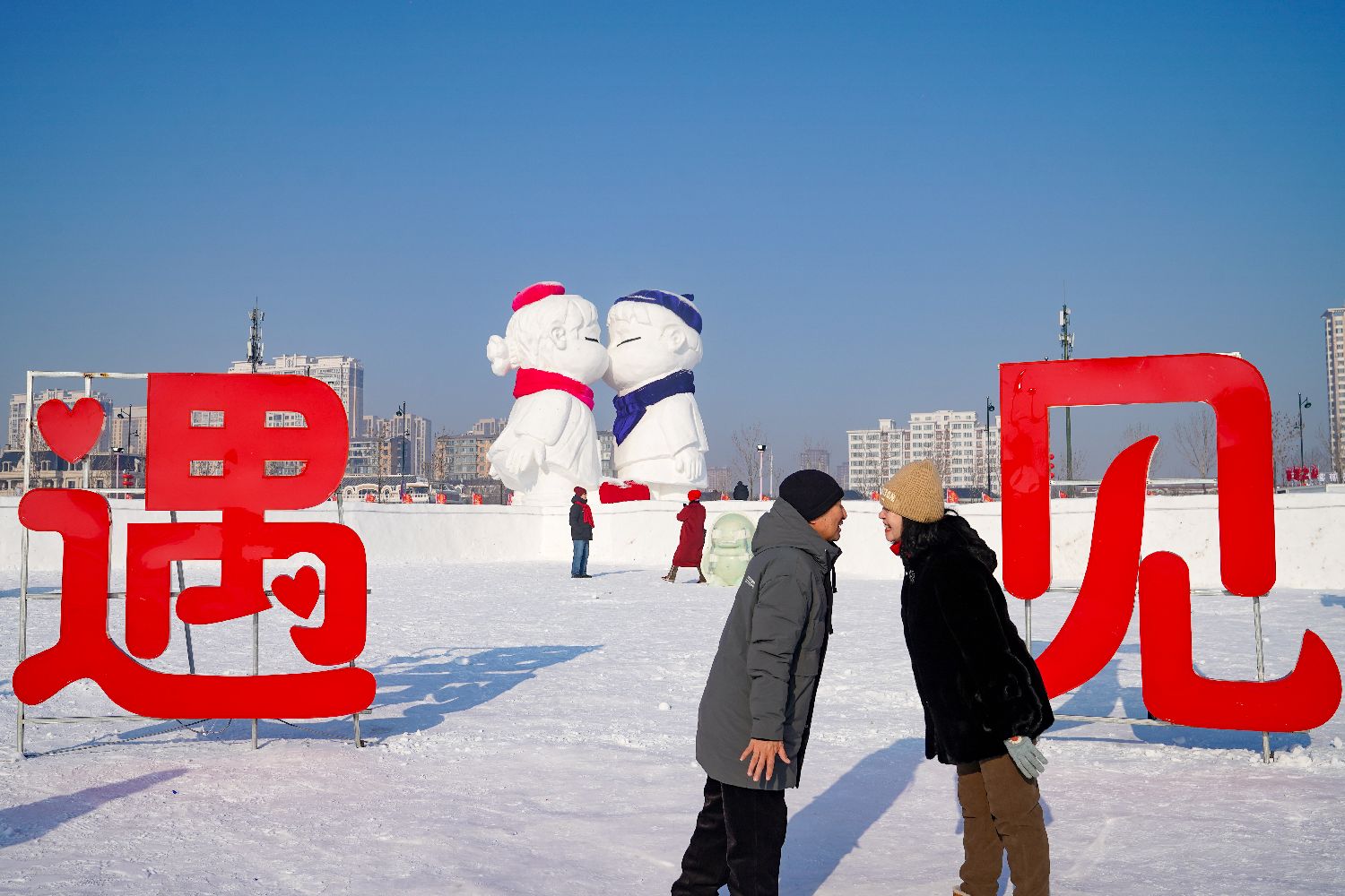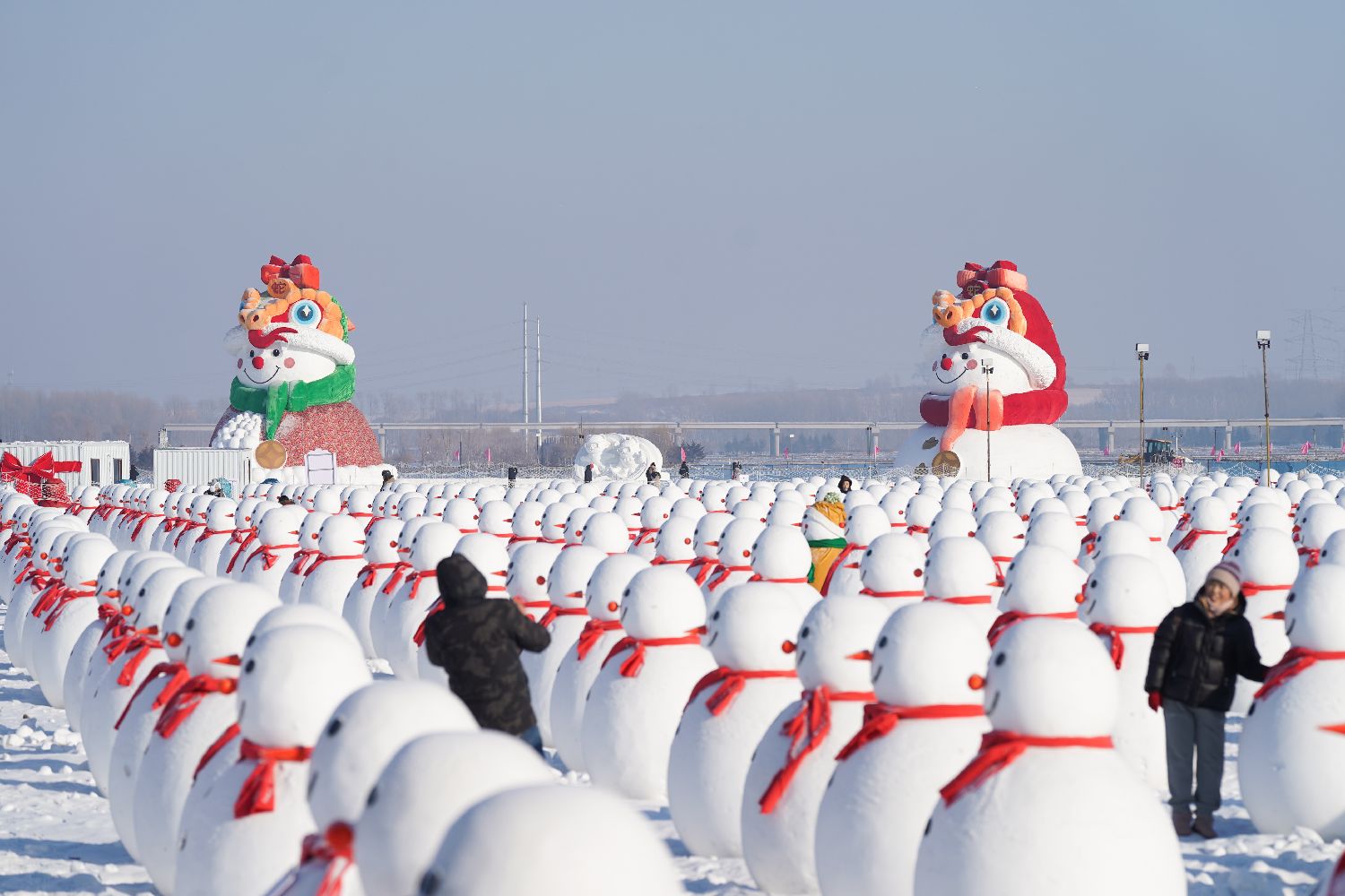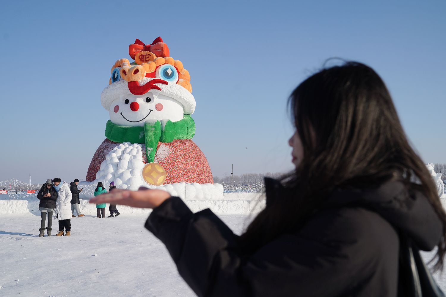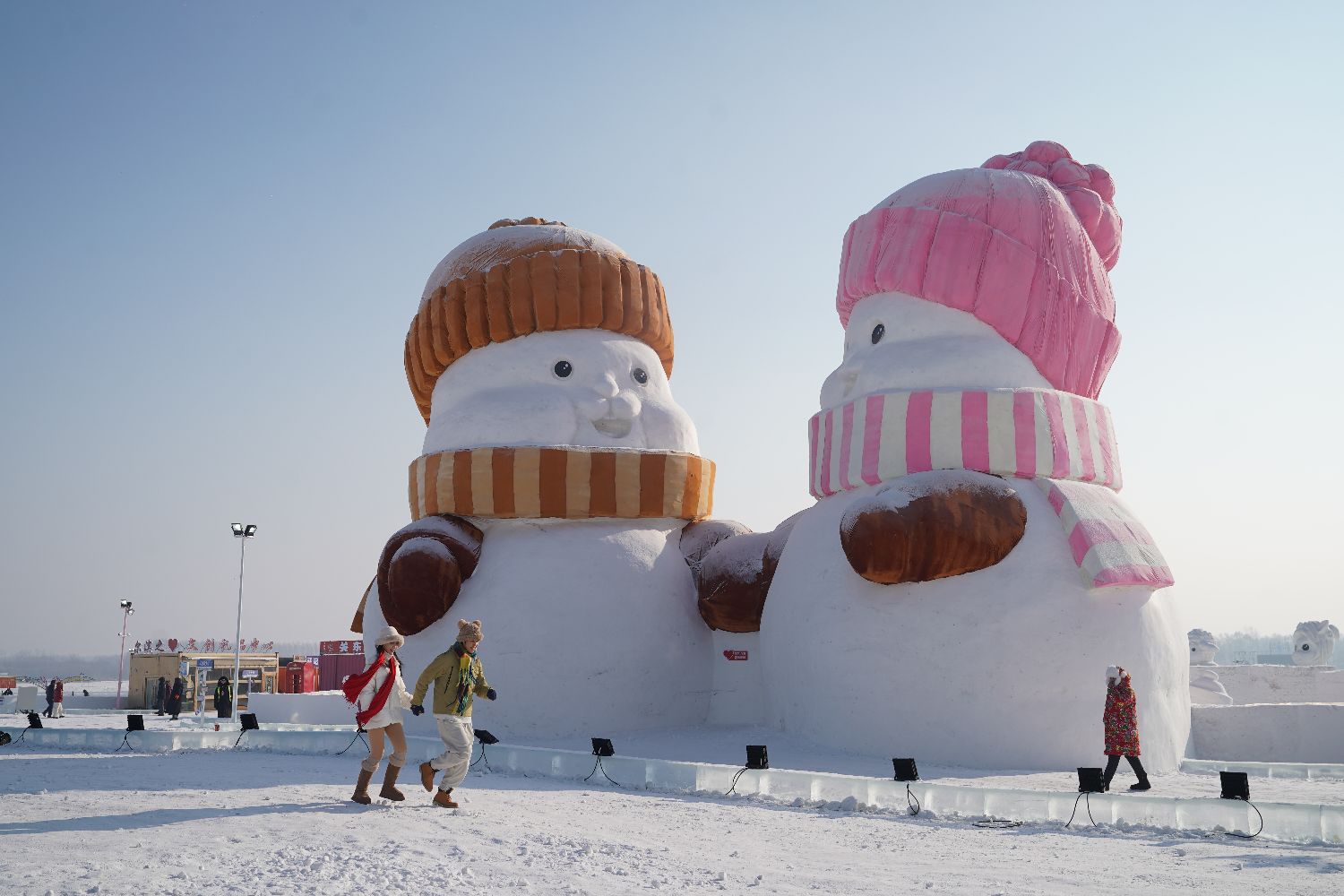 近日,哈尔滨各处雪人陆续上新,生肖元素雪人、宇航员造型雪人、亲亲雪人等陆续亮相。图为1月2日,游客在闫家岗农场里与雪人拍照。中新社