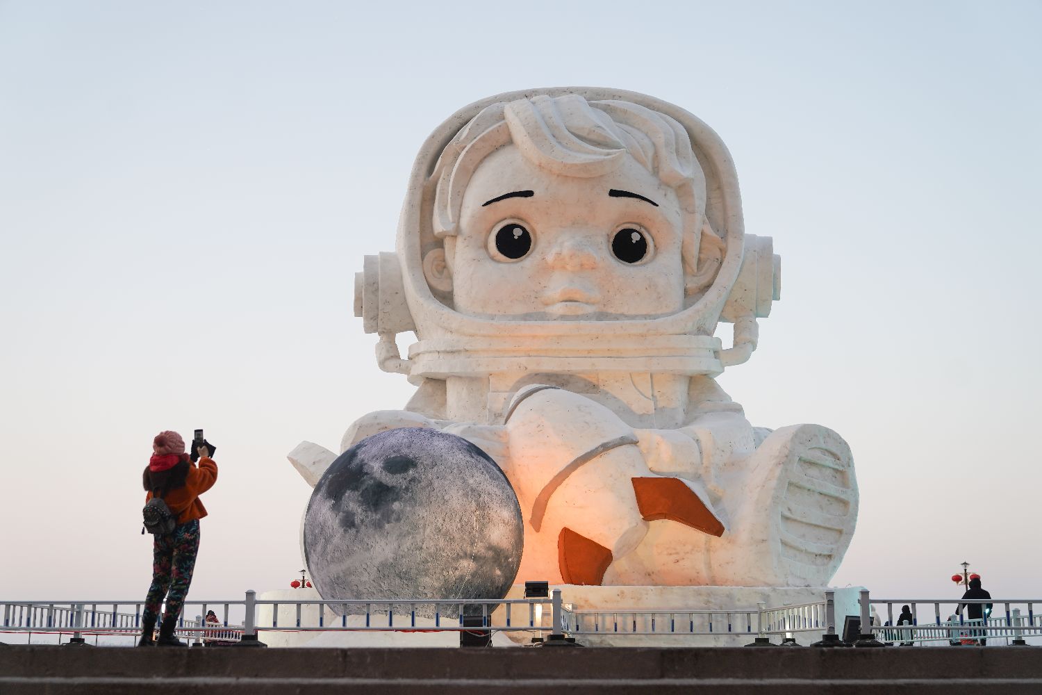 1月2日,景阳广场里宇航员造型雪人吸引游客。中新社