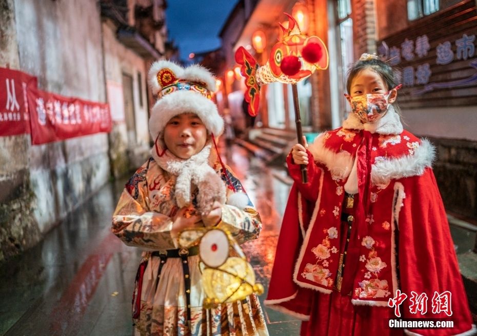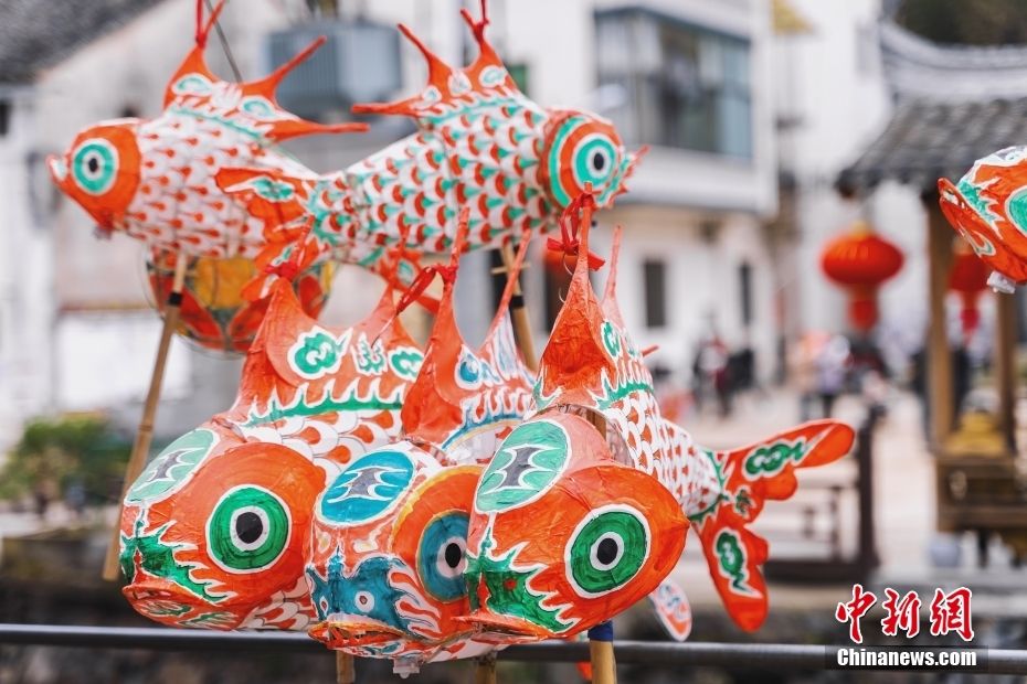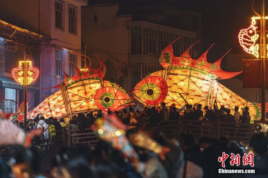 安徽歙县有两盏“鱼灯”,一盏在汪满田,一盏在瞻淇。一东一南,遥遥相对,两盏鱼灯一舞便是数百年,展现了这座千年古城的深厚底蕴。“舞鱼灯”是歙县新春佳节的重头戏。除此之外,在其他活动中我们也能看到歙县鱼灯的身影。夜幕之下,人们托举鱼灯游走在街头巷尾,光影交错间尽显中式浪漫。来安徽歙县体验一场“大鱼”奇妙游吧,一起感受鱼灯非遗的古韵悠长,承接年年有“鱼”的美好祝福。图为鱼灯在瞻淇村主街上进行表演,引得众多游客拍照留念。