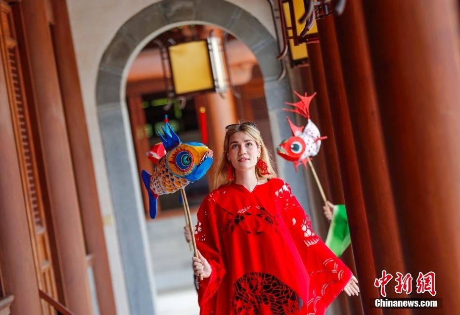 歙县鱼灯越来越出圈出彩,不少游客“为一条鱼奔赴一座城”。图为来自俄罗斯的国际体验官Sasha在徽州古城打卡体验。