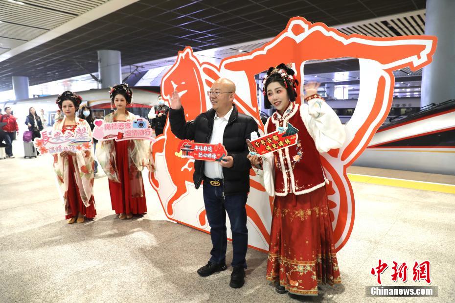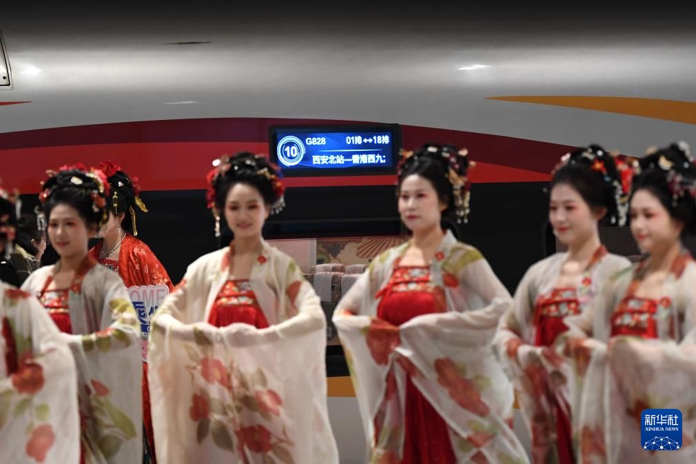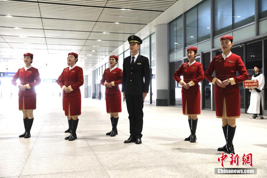 1月5日,在西安北站,身穿汉服的铁路工作人员在西安北至香港西九龙复兴号动车首发仪式上为旅客表演。新华社