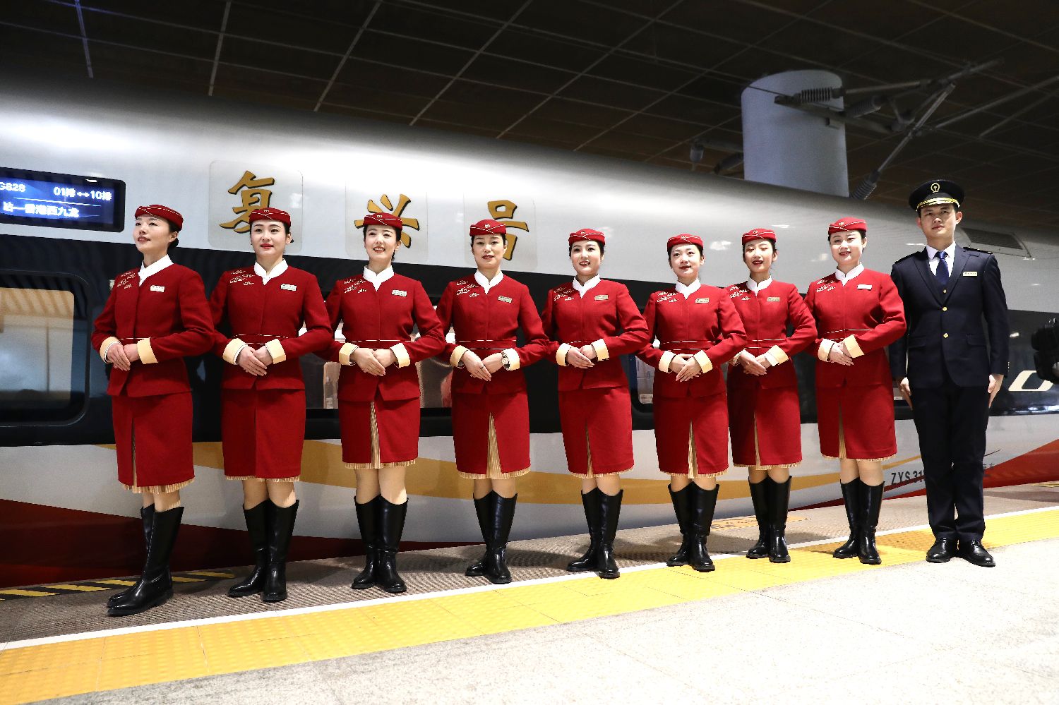 G828次高铁列车乘务组身着全新制服亮相。中新网