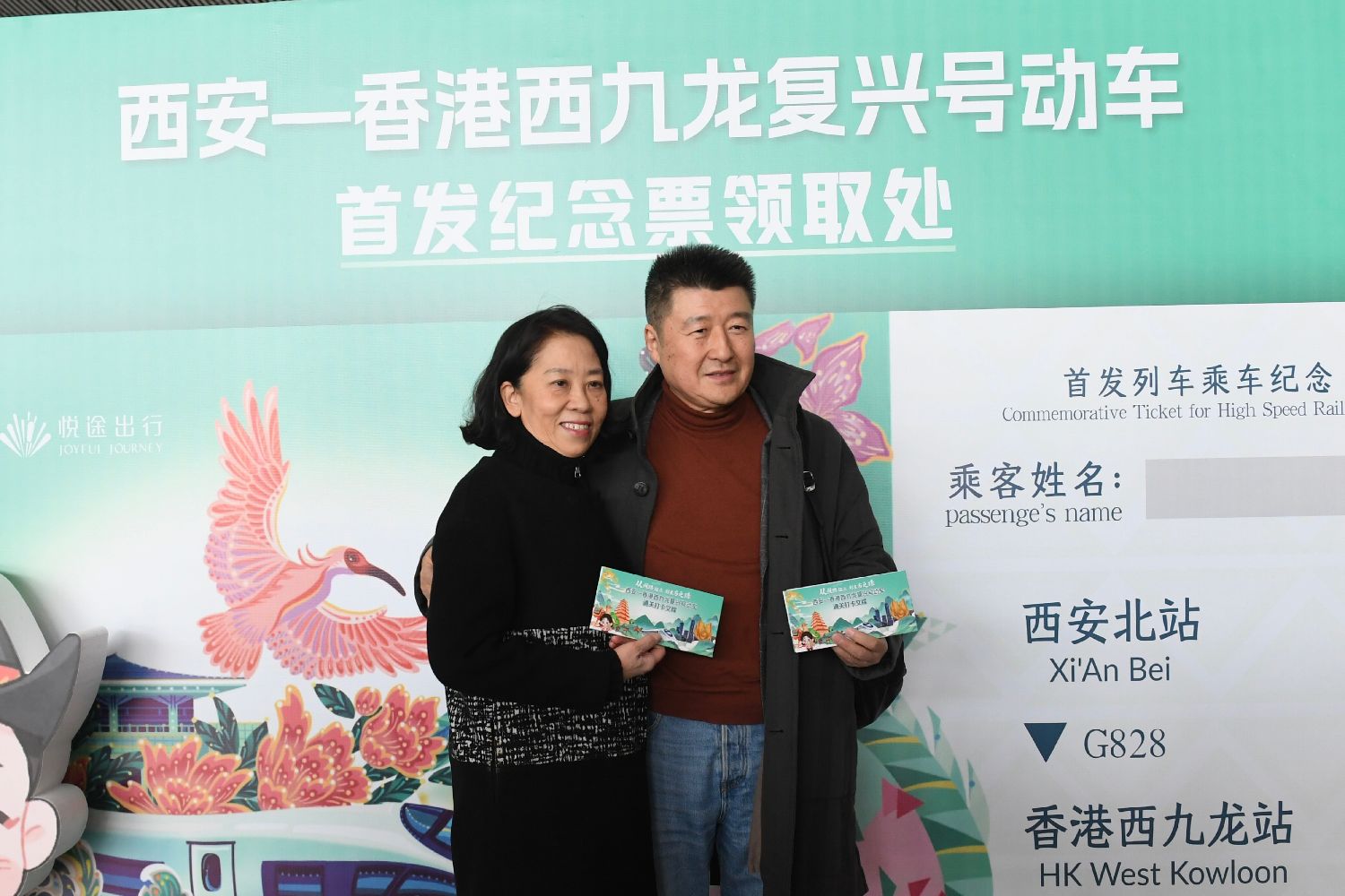 1月5日,即将搭乘G828次高铁的旅客张若昕(右)夫妇在首发纪念票领取处合影。中新社