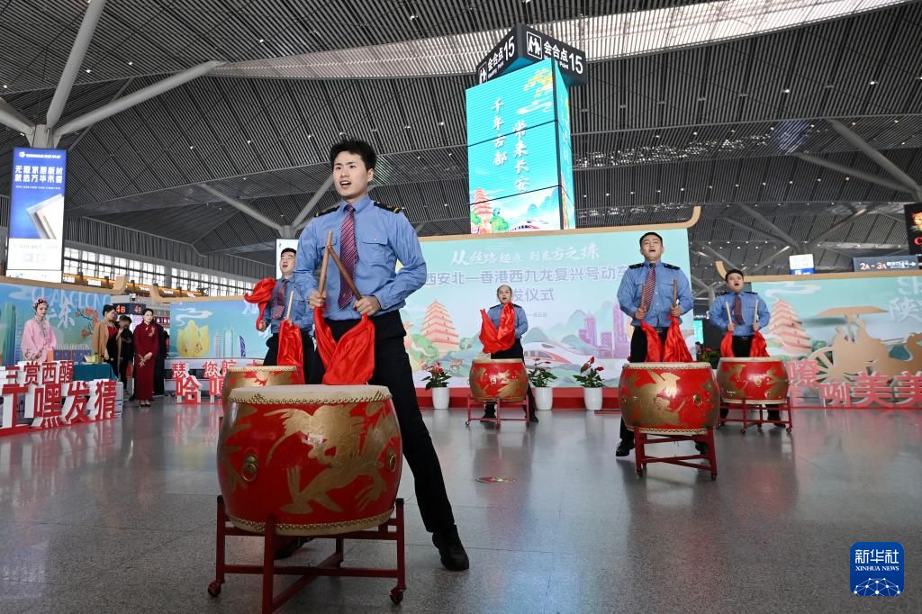 1月5日,在西安北站候车大厅,铁路工作人员在西安北至香港西九龙复兴号车首发仪式上为旅客表演。新华社