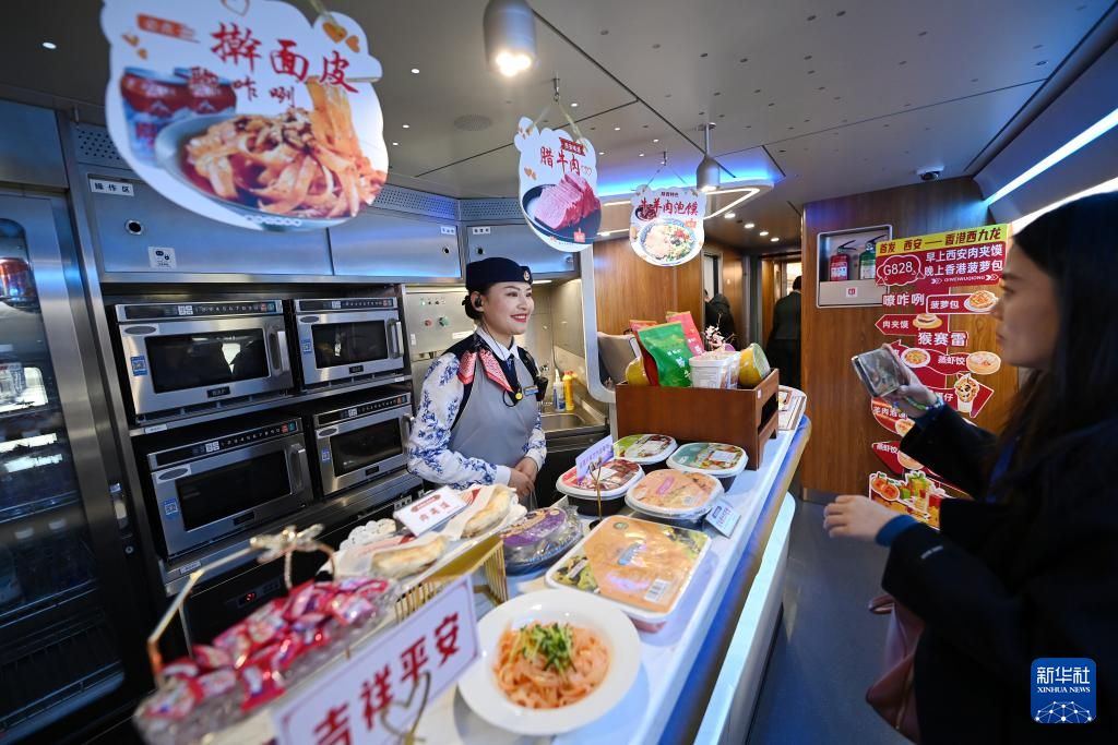 1月5日,担当陕港列车值乘任务的“长安之馨”西港乘务人员为旅客介绍餐车服务情况。新华社