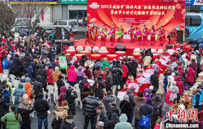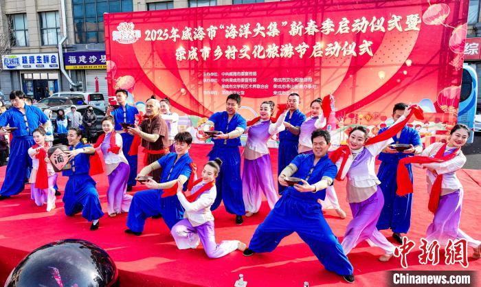 连日来,“海洋大集”新春季活动在山东沿海等地启动,通过丰富多彩的表演与特色展示,展现山东海洋文化魅力。图为1月7日,在山东省荣成市,大量游客观赏渔家锣鼓、渔家秧歌、渔民号子等表演,并品尝丰盛的海鲜宴。中新网