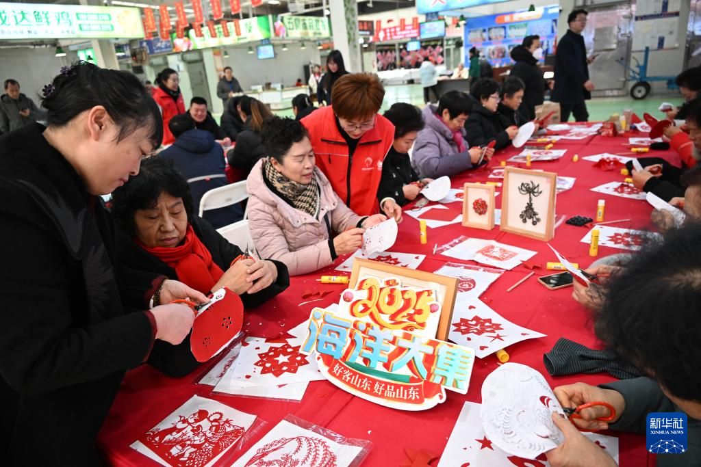 1月7日,在青岛市城阳区,市民在“海洋大集”公共艺术课堂上学习剪纸。新华社