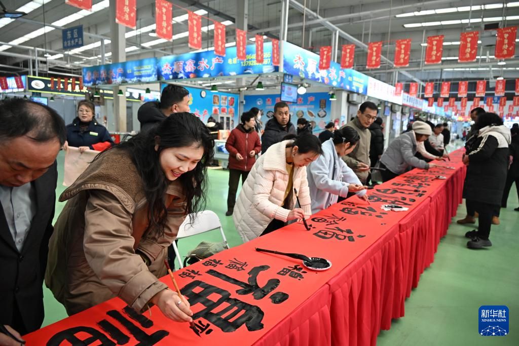 1月7日,在青岛市城阳区,人们在“海洋大集”上共同书写福字。新华社
