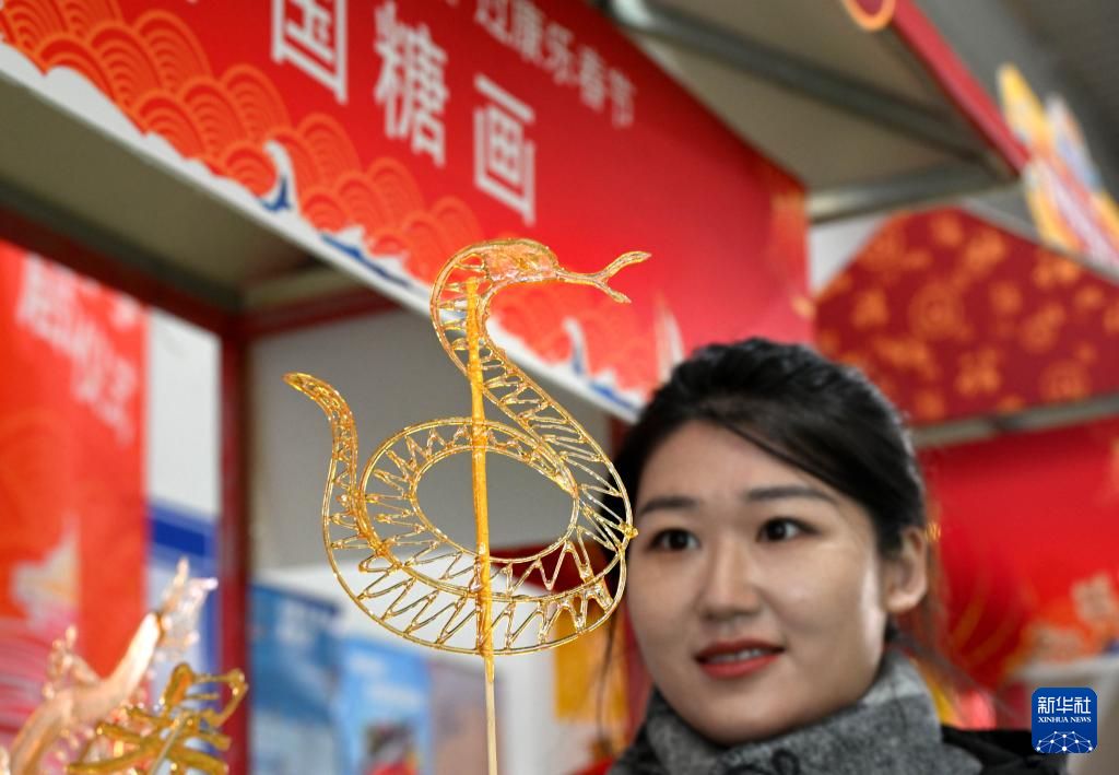 1月7日,在青岛市城阳区,一名女子在“海洋大集”非遗文化市集上选购糖画。新华社