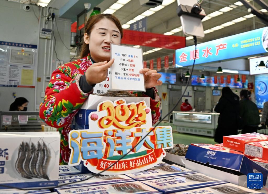 1月7日,在青岛市城阳区,一名商户在城阳水产海鲜批发市场内直播带货。新华社