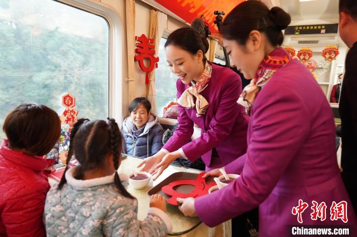 在重庆西开往北京西的T10次列车上,重庆客运段精心组织腊八节主题活动,邀旅客与乘务员共同体验传统民俗,欢度腊八节,以腊八节为主题的“带你‘粥’游世界”活动吸引不少游客,现场免费赠送腊八粥和腊八蒜,让游客在品尝传统美食的同时感受浓浓的节日氛围。图为在T10次列车上,乘务员为旅客送上腊八粥。中新网