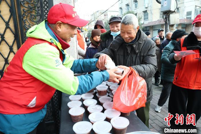 1月7日,浙江台州温岭市慈善义工协会举办“熬香腊八粥 送暖情更浓”活动,为市民免费提供精心熬制的腊八粥。这场温暖的坚守,已延续了20年。图为志愿者发放腊八粥。中新网
