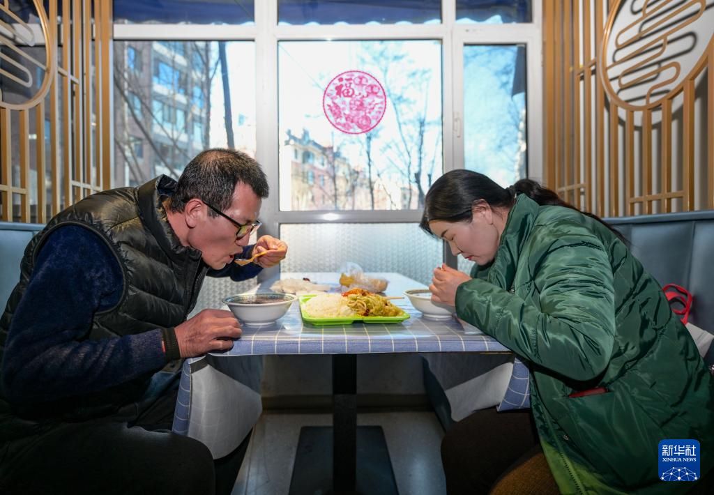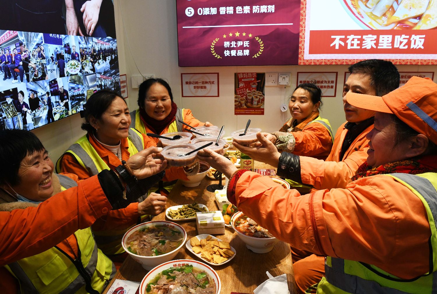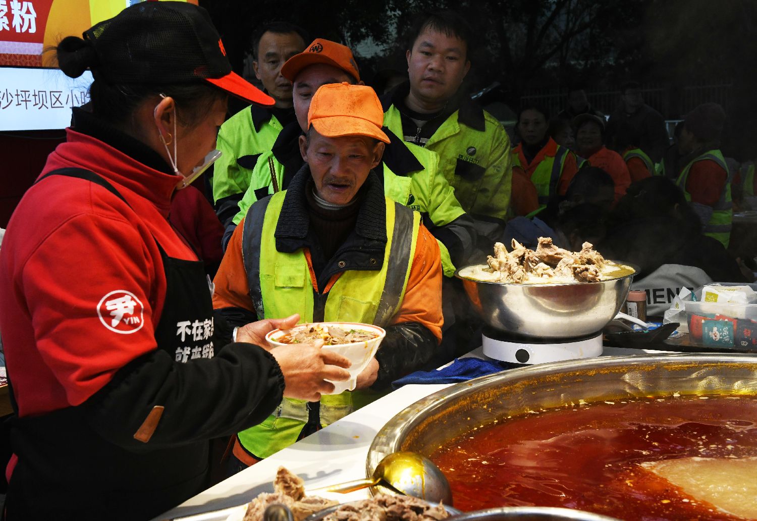 1月7日,位于重庆市沙坪坝区陈家桥街道的一家餐厅,餐厅工作人员为环卫工人发羊肉粉。中新社