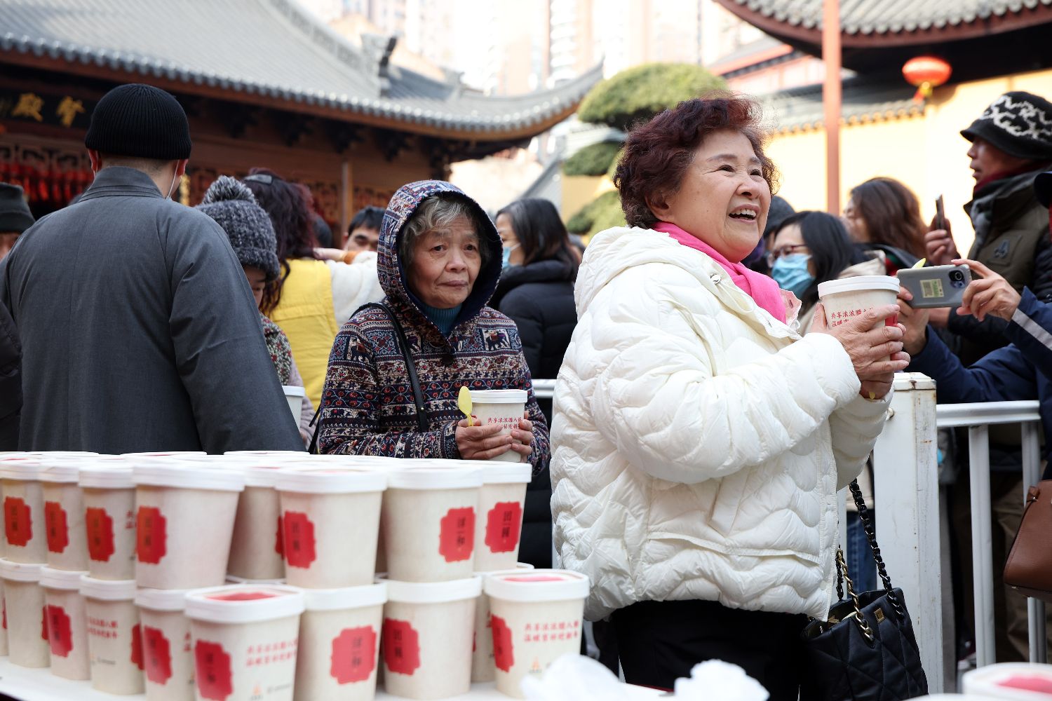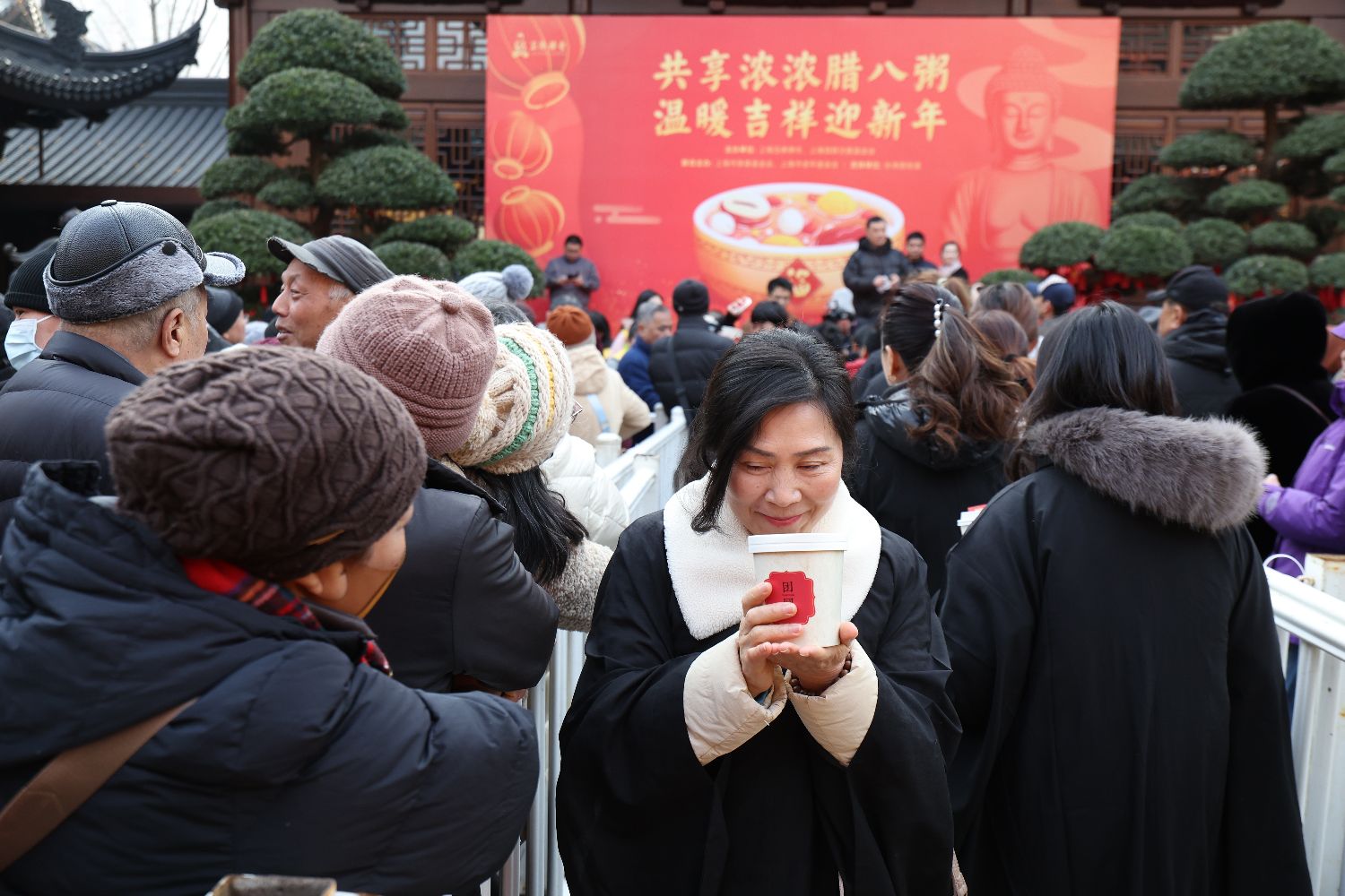 1月7日,上海玉佛禅寺举行“共享浓浓腊八粥,温暖吉祥迎新年”腊八赠粥活动,吸引了众多市民前来排队领粥。中新社