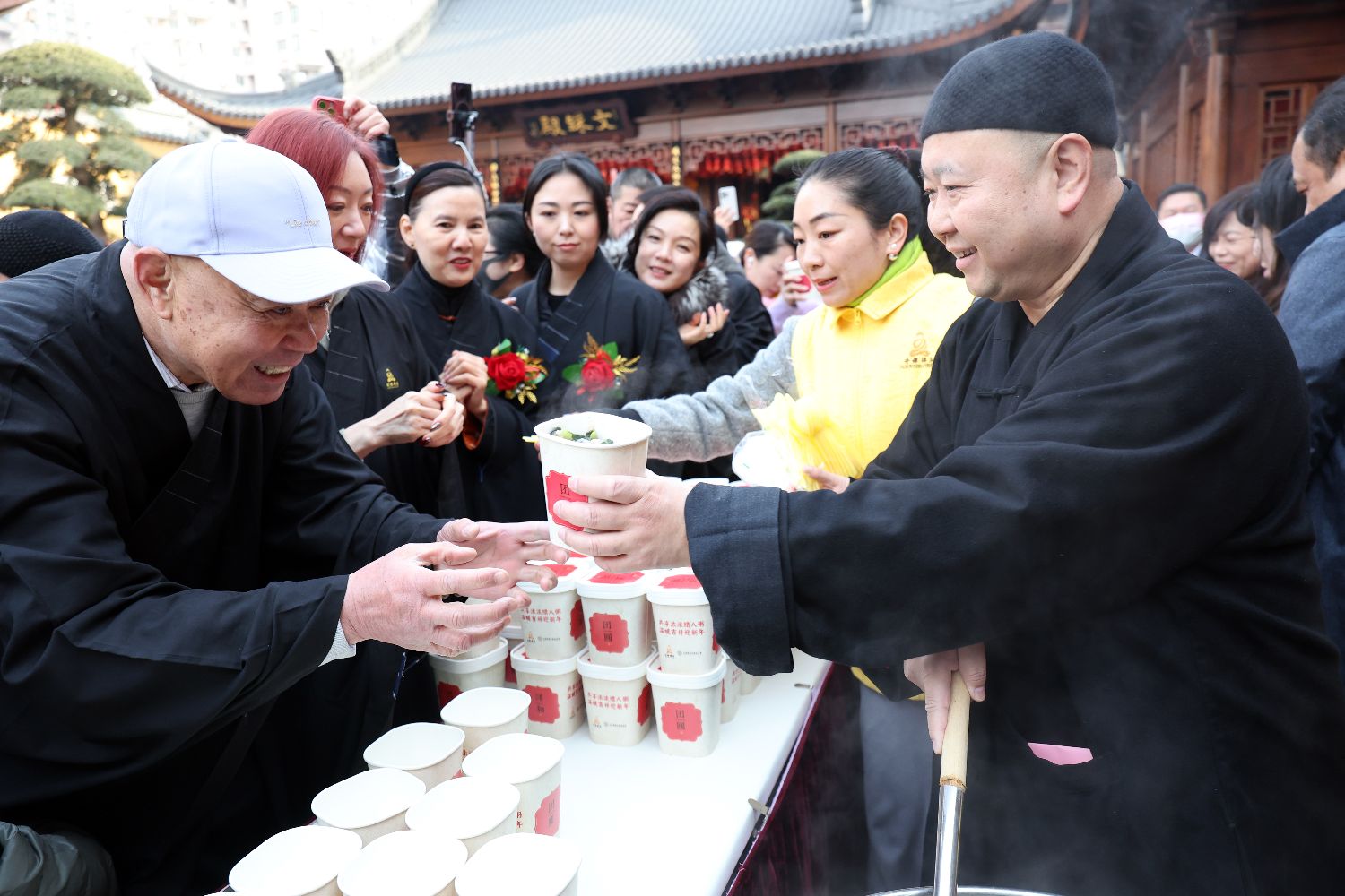 1月7日,上海玉佛禅寺方丈觉醒法师向民众赠粥送福。中新社