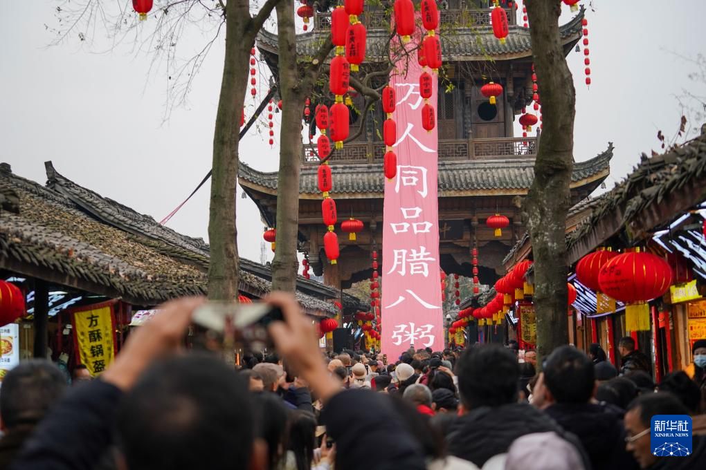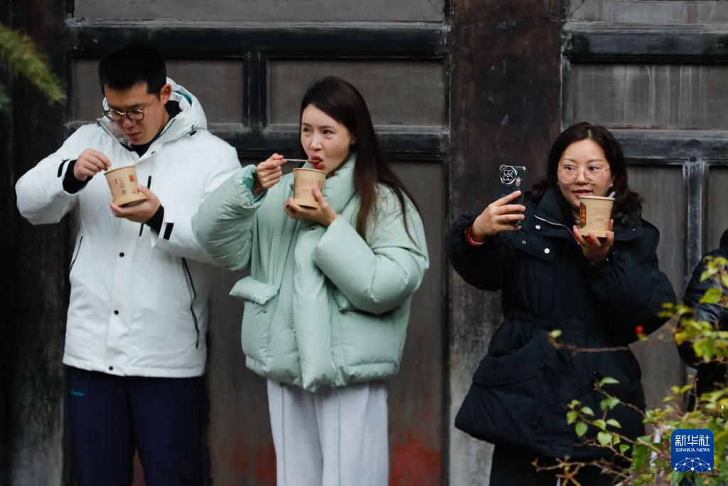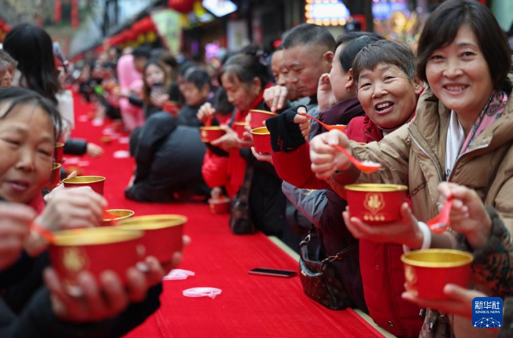 1月7日,人们在阆中古城享用腊八粥。新华社
