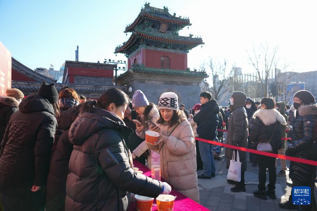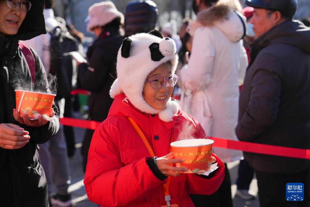 1月7日,市民游客在北京民俗博物馆举办的“腊八赠福粥 喜迎中国年”活动上领取腊八粥。新华社