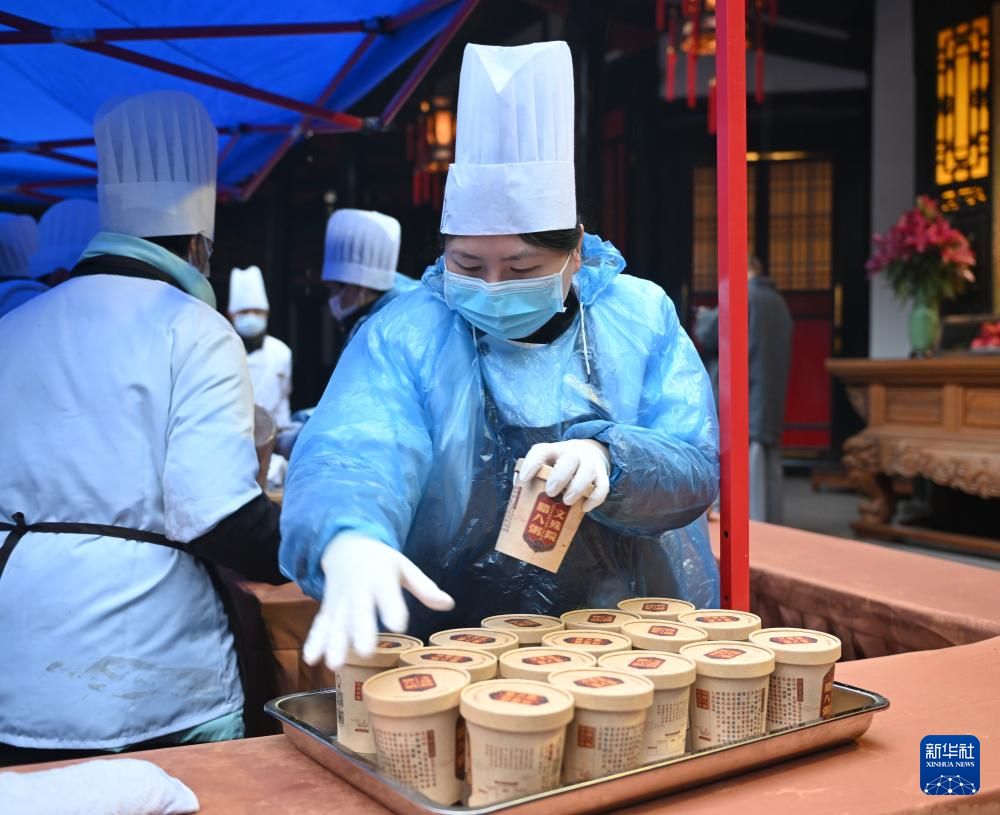 1月7日,人们在四川省成都文殊院品尝免费领取的腊八粥。新华社