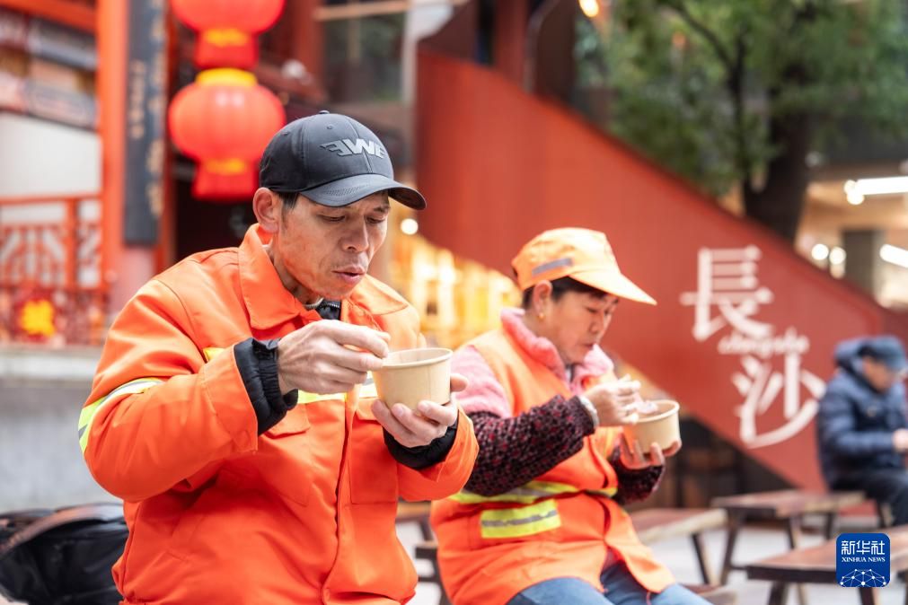 1月7日,在湖南省长沙市坡子街火宫殿,环卫工人在品尝免费领取的腊八粥。新华社