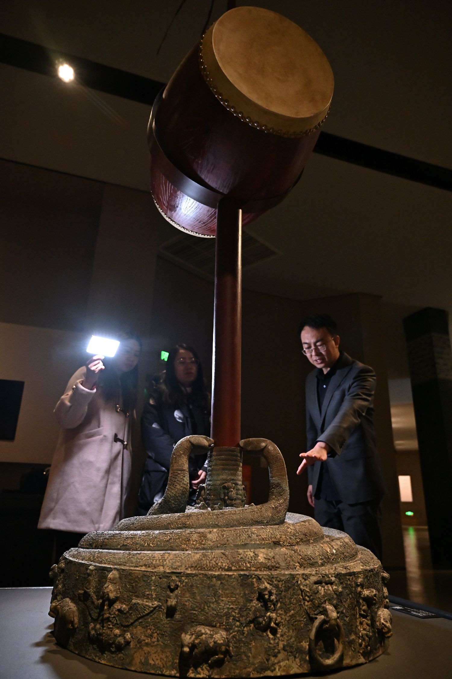 山西青铜博物馆工作人员(右)讲解战国时期文物——蟠蛇纹建鼓座。中新社