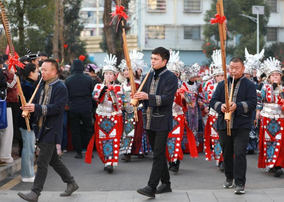 1月12日,贵州省黔南布依族苗族自治州都匀市小围寨街道思源社区民众欢聚一堂,一起跳竹竿舞、芦笙舞,观看舞龙、舞狮表演,参与打糍粑、趣味游戏等活动,一起吃团圆宴,共迎幸福年。图为民众表演芦笙舞。新华社