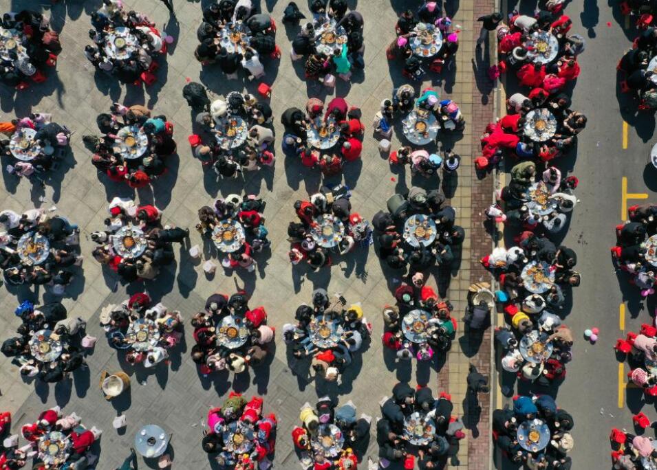 1月12日,民众在贵州省黔南布依族苗族自治州都匀市小围寨街道思源社区一起吃团圆宴。新华社