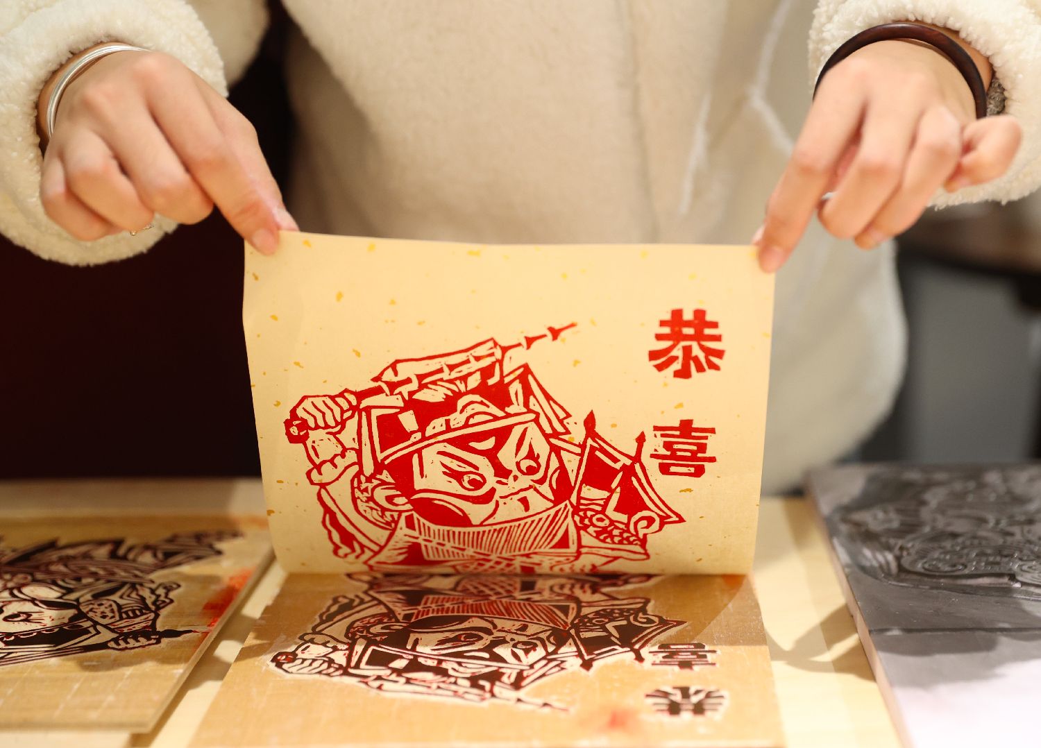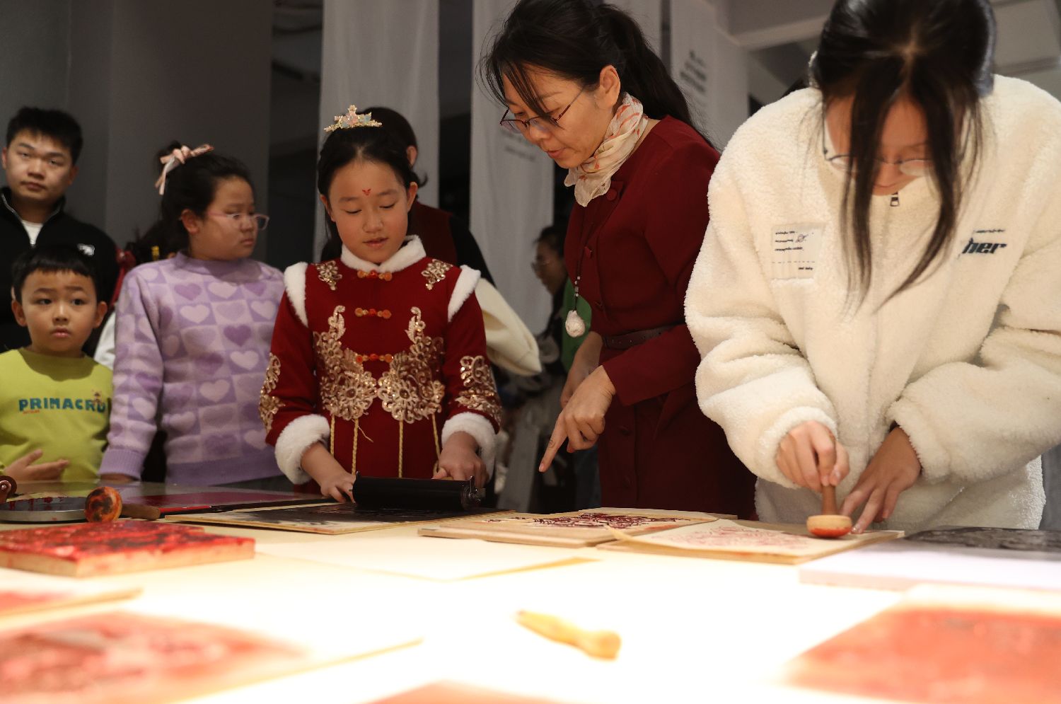 1月12日,“前程螣螣——当生肖遇见版画”分享会在宁夏银川怀远书房举行,民众通过参与活动,感受中国传统艺术的魅力,迎接春节的到来。图为市民在制作版画。当日,中新社