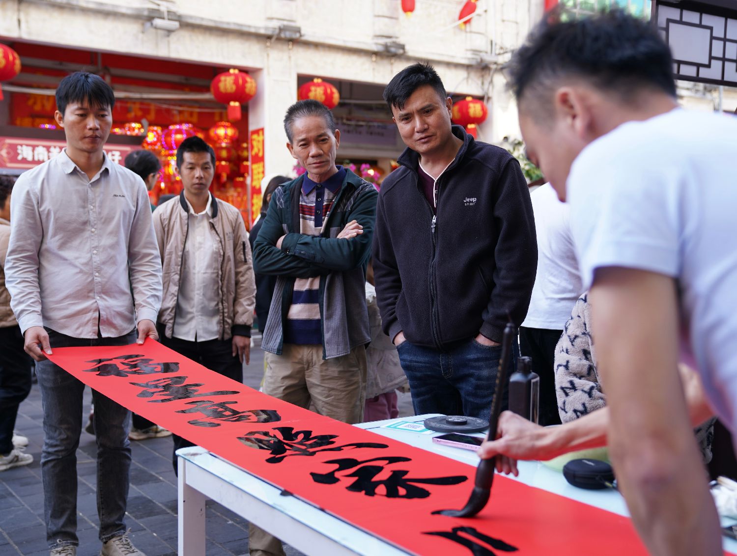 春节临近,海南海口骑楼老街装点一新,吸引各地游客前来感受侨乡年味。图为1月12日,民众在骑楼老街观看商家写春联。中新社