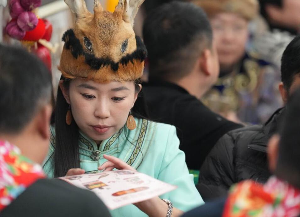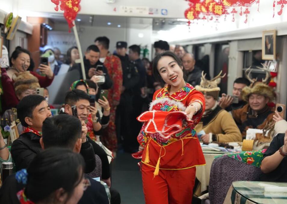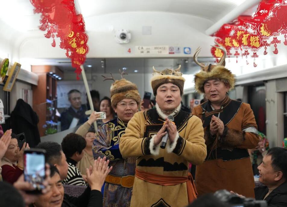 1月11日,在黑龙江省哈尔滨开往漠河的K7041次列车上,五名鄂伦春族非遗文化传承人为旅客展示桦树皮烫画、面塑、刺绣等非遗项目。据了解,这是中国铁路哈尔滨局集团有限公司开行的首趟民族非遗文化列车。随着黑龙江省冰雪游持续火热,中国铁路哈尔滨局集团有限公司联合大兴安岭地区文体广电和旅游局,在哈尔滨至漠河方向开行民族非遗文化列车,邀请非遗传承人现场展示传统民族技艺,弘扬民族文化。图为鄂伦春族“赞达仁”传承人古拉依尔恩特(中)在K7041次列车上演唱。