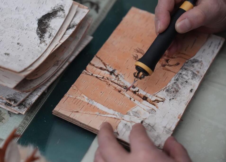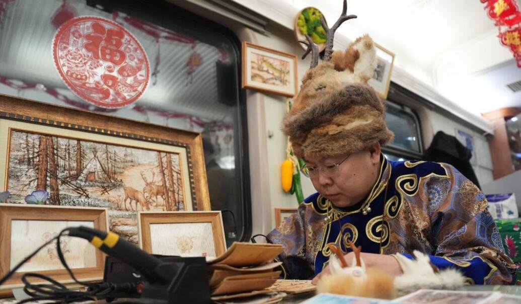 1月11日,杜拉尔氏桦树皮烫画非遗传承人杜辉在K7041次列车上制作桦树皮烫画。