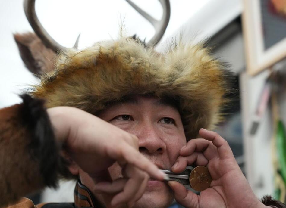 1月11日,鄂伦春族传统口技非遗传承人王佳玥在K7041次列车上表演口弦琴。