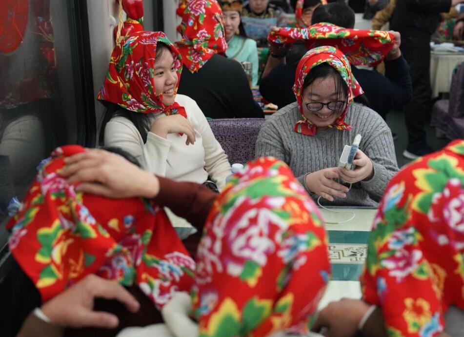 1月11日,旅客在K7041次列车上观看民俗表演。