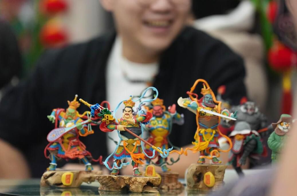 1月11日,康氏面塑传承人康建在K7041次列车上展示面塑。